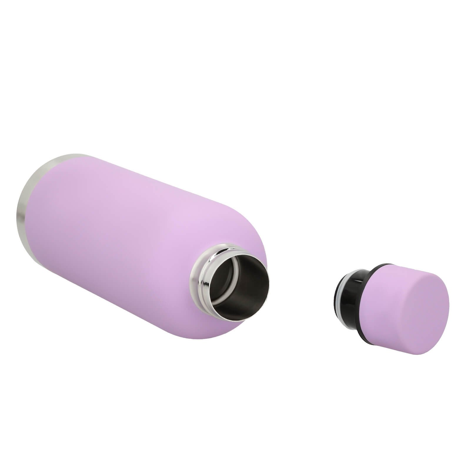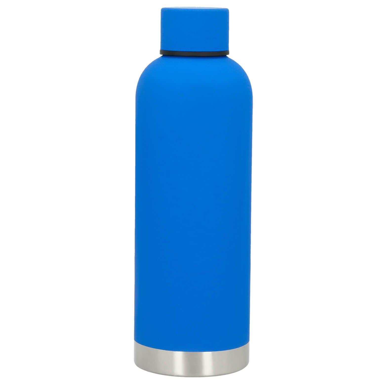 Termo de acero inoxidable de doble pared insulado al vacío con acabado rubber y tapa enroscable.