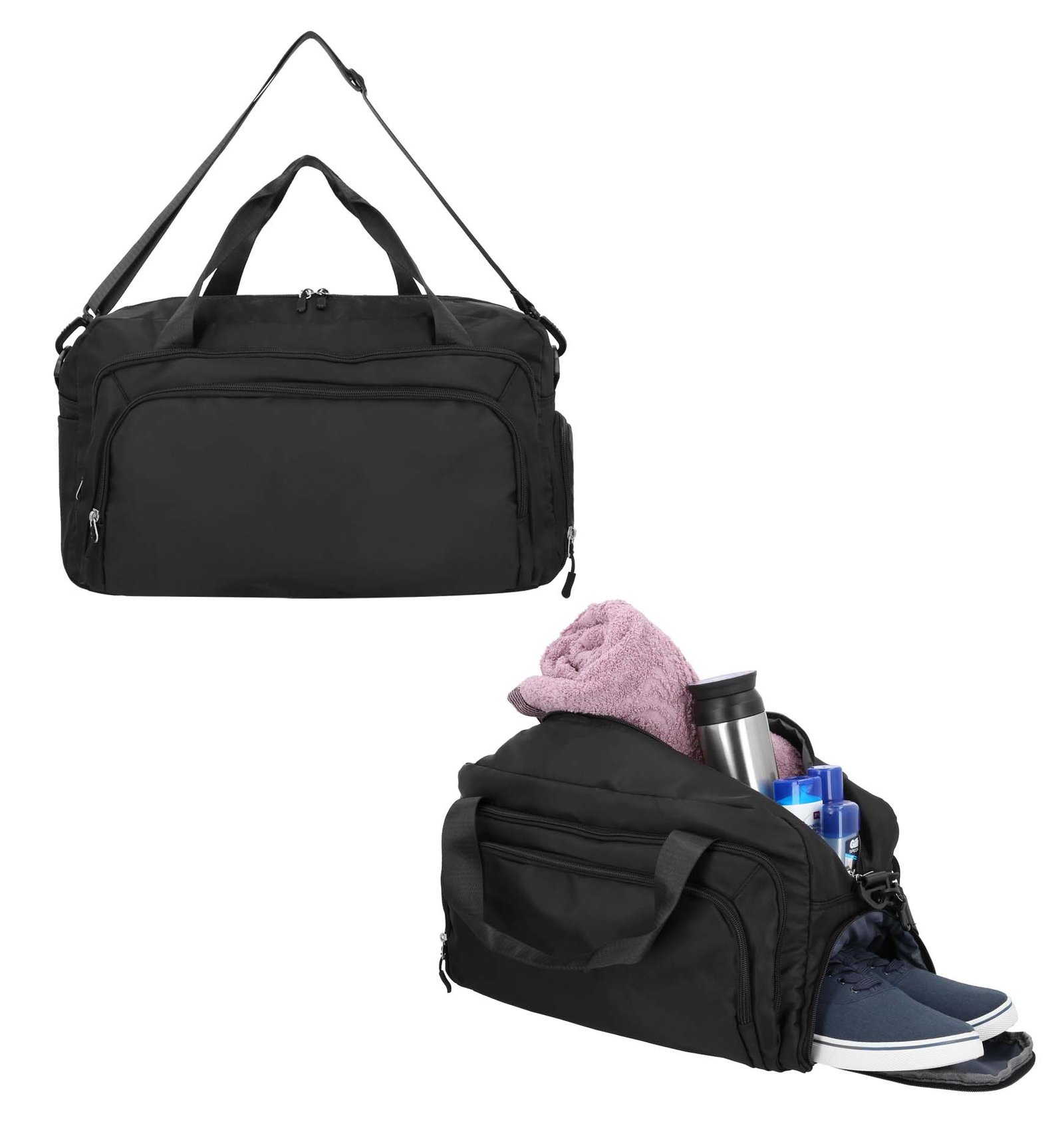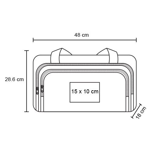 Maleta con 1 compartimento principal, 2 compartimentos frontales, zapatera, 1 compartimento lateral y asas., medidas: 48.0 x 28.6 cm, material: Poliéster, capacidad: 27 lts, métodos de grabado: DTF,Serigrafía