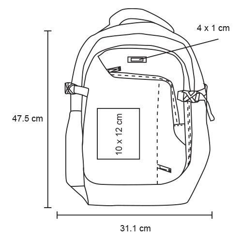 Mochila de 1 compartimento principal con porta laptop, 1 compartimento secundario con organizador, 2 bolsas frontales con cierre, 2 bolsas laterales, respaldo acolchado, tirantes con broche, carry on y asa superior., medidas: 31.1 x 47.5 cm, material: Poliéster, capacidad: 38 lts, métodos de grabado: Serigrafía