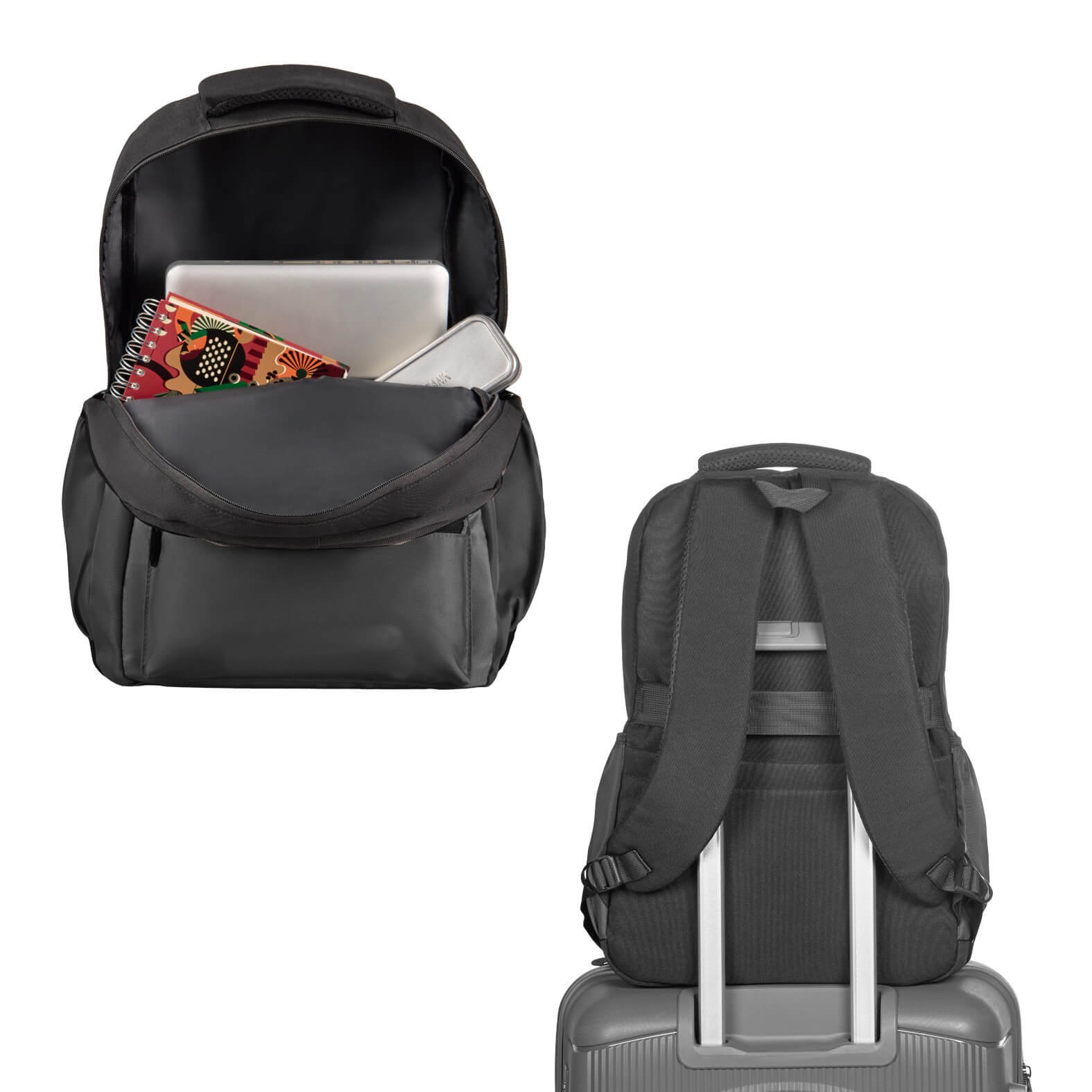 Mochila con compartimento principal con porta laptop de 17.5″, tres bolsas frontales con cierre, dos bolsas laterales con elástico, tirantes acolchados, respaldo con bolsa trasera, banda carry-on y asa superior., medidas: 32.5 x 45.5 cm, material: Poliéster, capacidad: 32 lts, métodos de grabado: Serigrafía