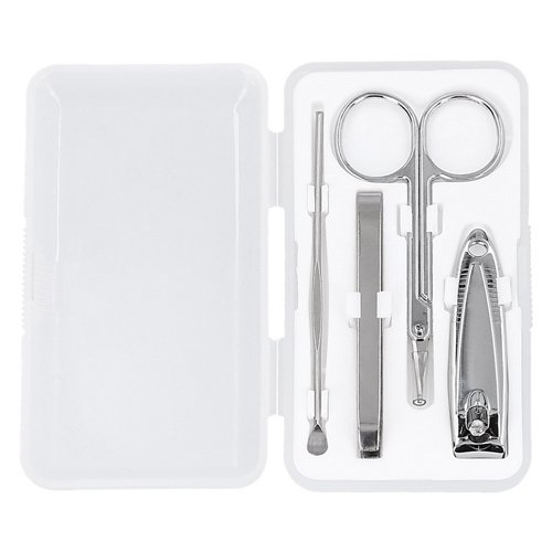Set de manicure en estuche de plástico con 4 piezas: tijeras, cortaúñas, pinzas para depilar y empujador de cutícula., medidas: 5.5 x 10.0 cm, material: Plástico, capacidad: , métodos de grabado: Serigrafía,Tampografía