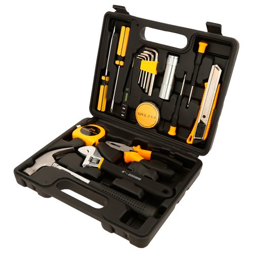 Set portátil de herramientas. Incluye 13 accesorios: 1 martillo, 1 llave perico de 8″, 1 flexómetro de 2 mts, 1 pinza, 1 cinta de aislar, 1 cutter, 1 juego de 5 llaves Allen, 1 desarmador plano, 1 desarmador de cruz, 1 lápiz detector de voltaje, 2 destornilladores de precisión y 1 linterna que requiere 3 baterías AAA (no incluidas)., medidas: 27.0 x 21.5 cm, material: Plástico/ Metal, capacidad: , métodos de grabado: Serigrafía,Tampografía