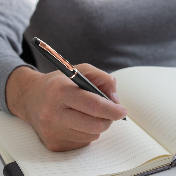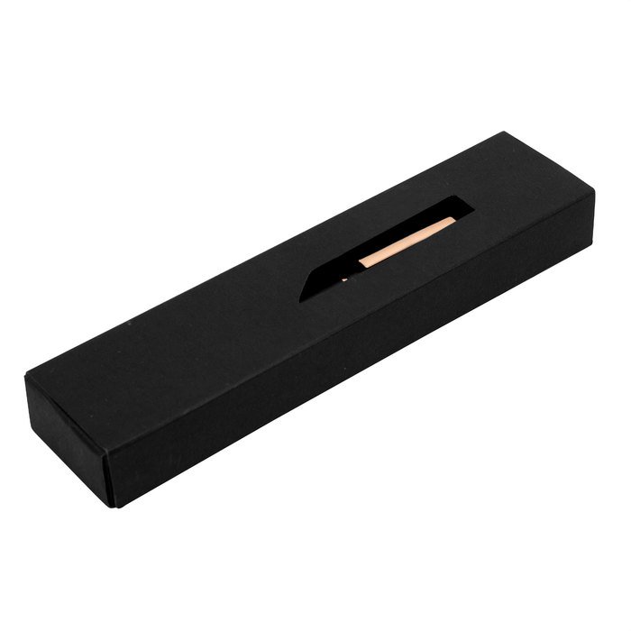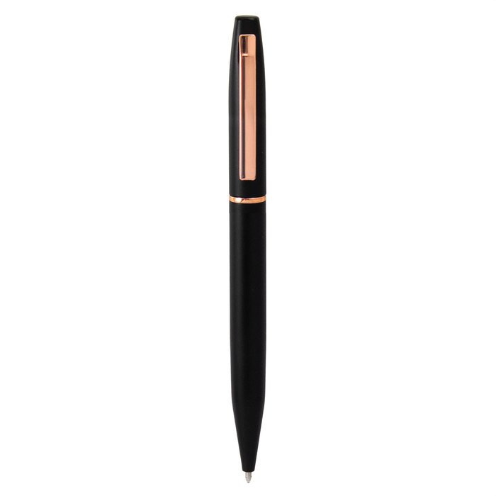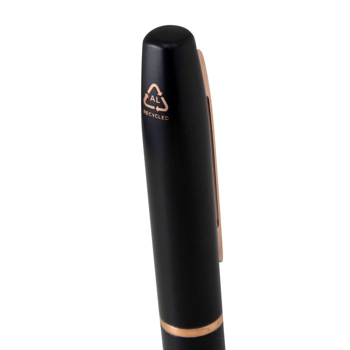 Bolígrafo con apertura giratoria. Cuerpo metálico en negro mate. Cuerpo de aluminio reciclado. Destape electroplateado en cobre en la parte superior. Recarga metálica. Clip y anillos metálicos color gold rose. Medidas: 13,3 cm. Material: Aluminio reciclado y hierro.