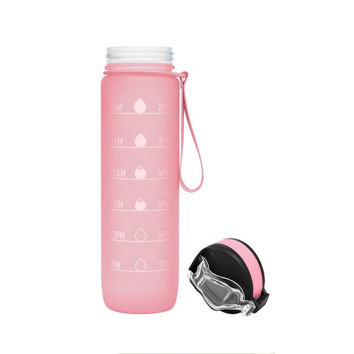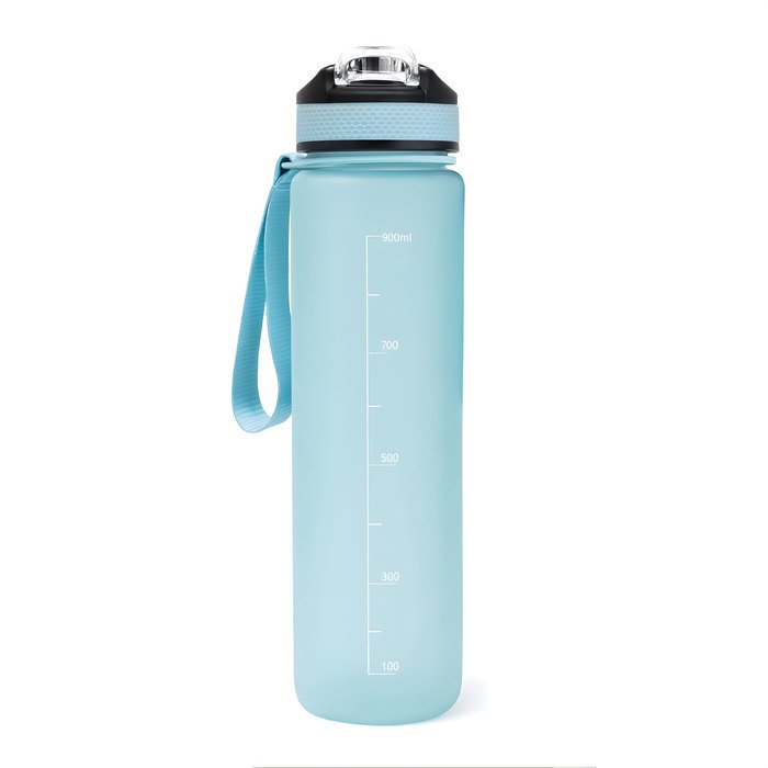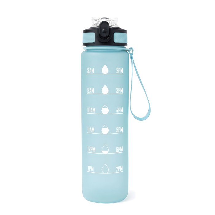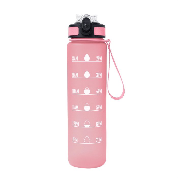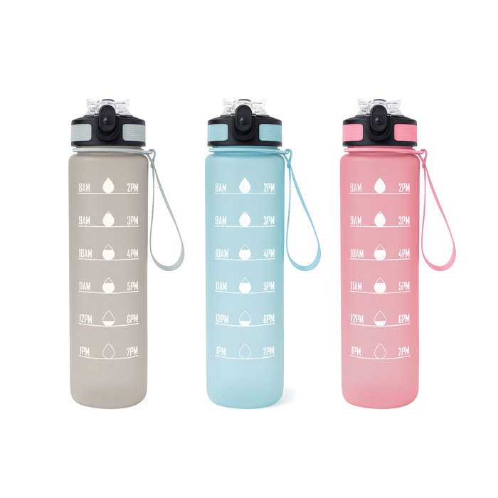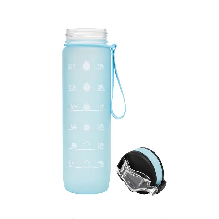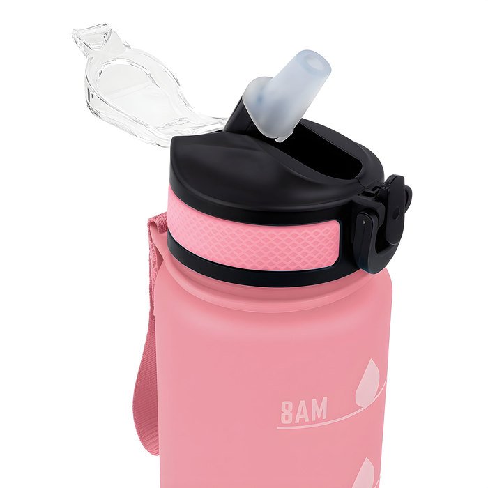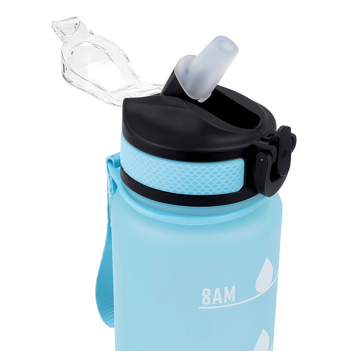 Botella deportiva motivacional. Botella de color pastel con acabado frost. Tapa plástica combinada en color negro con el de la botella. Apertura rápida, boquilla transparente rebatible y popote incluído. Correa del mismo color de la botella.
