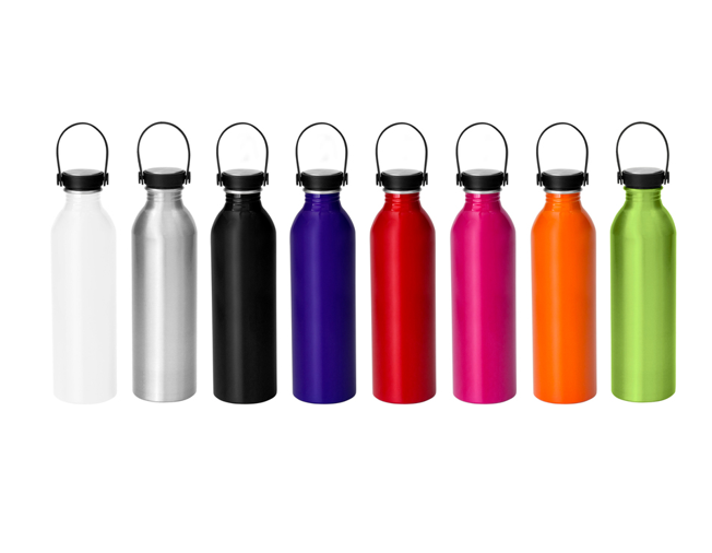 Botella de aluminio con acabado brillante. Tapa a rosca de acero inoxidable 201 y Polipropileno, con tira de silicona color negro Medidas: Ø 6,5 x 23cm. Capacidad: 640 ml. Materiales: Aluminio, Polipropileno y silicona