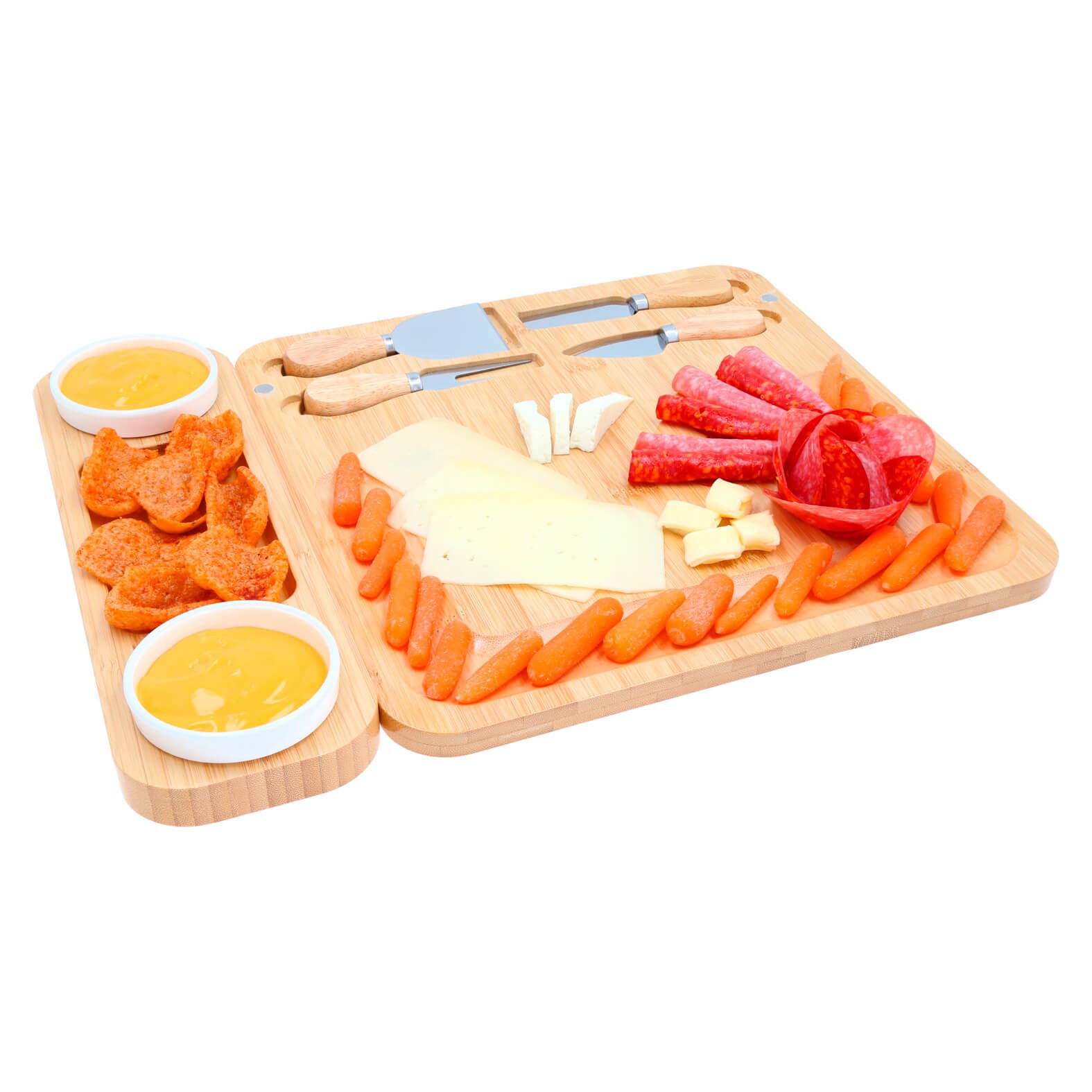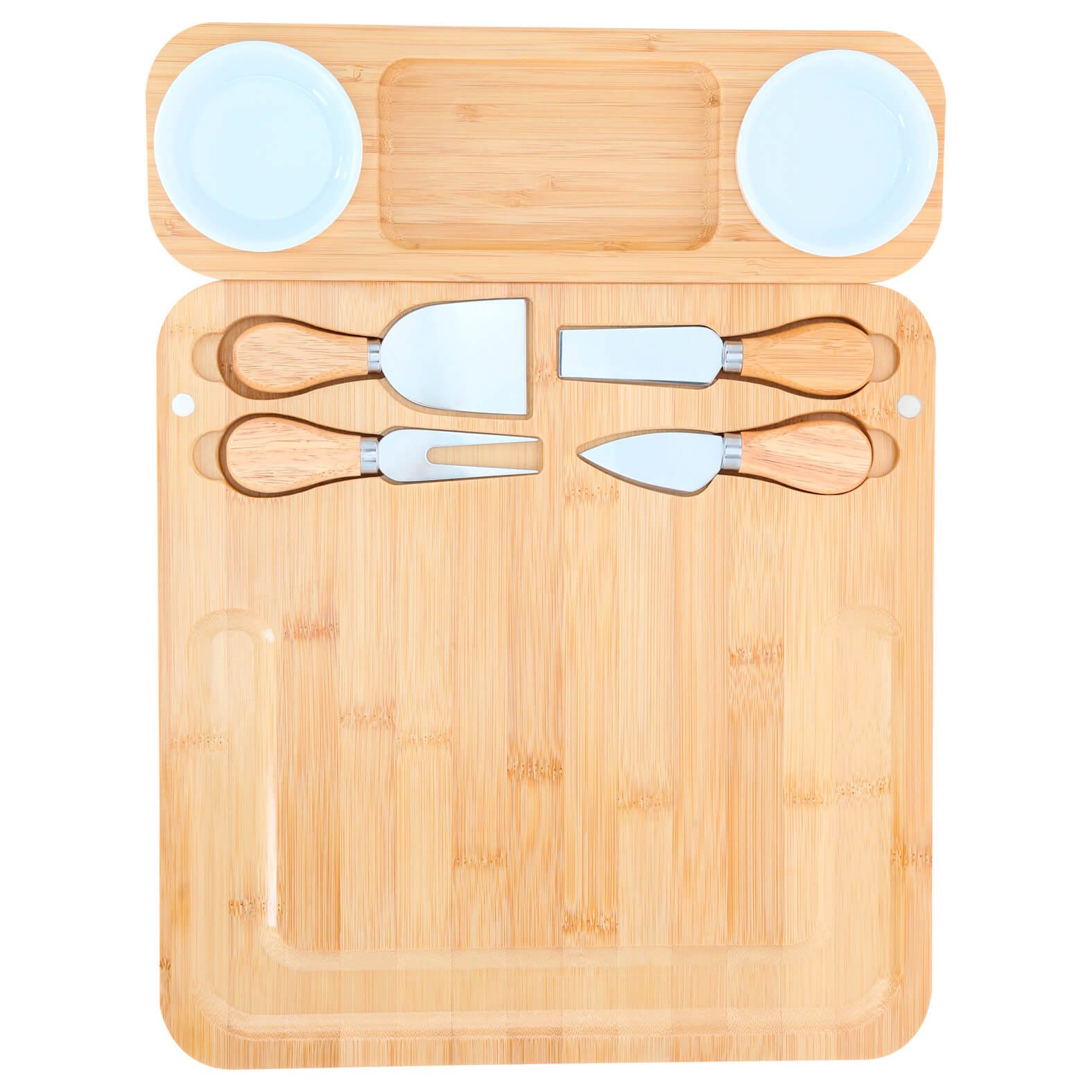 Tabla de quesos separable que incluye 2 mini platos de cerámica, 1 tenedor, 1 cuchillo, 1 cuchillo de avión estrecho y 1 cuchillo de pala., medidas: 31.7 x 21.0 cm, material: Bambú, capacidad: , métodos de grabado: Grabado Láser,Serigrafía,Tampografía