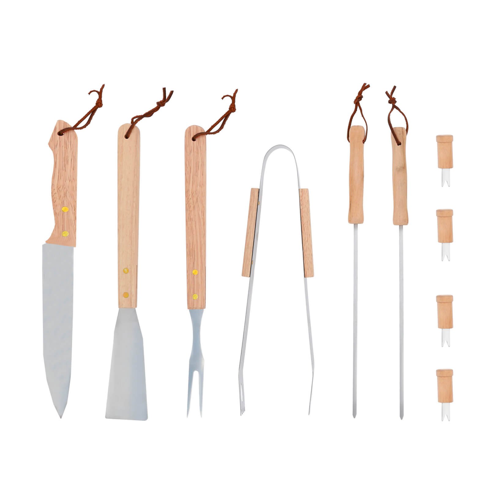 Set de bbq con cierre y correa. Incluye pinzas, tenedor, cuchillo, espátula, 2 brochetas y 4 pinchos para mazorcas., medidas: 43.0 x 14.6 cm, material: Madera / Metal, capacidad: , métodos de grabado: Grabado Láser,Serigrafía,Tampografía