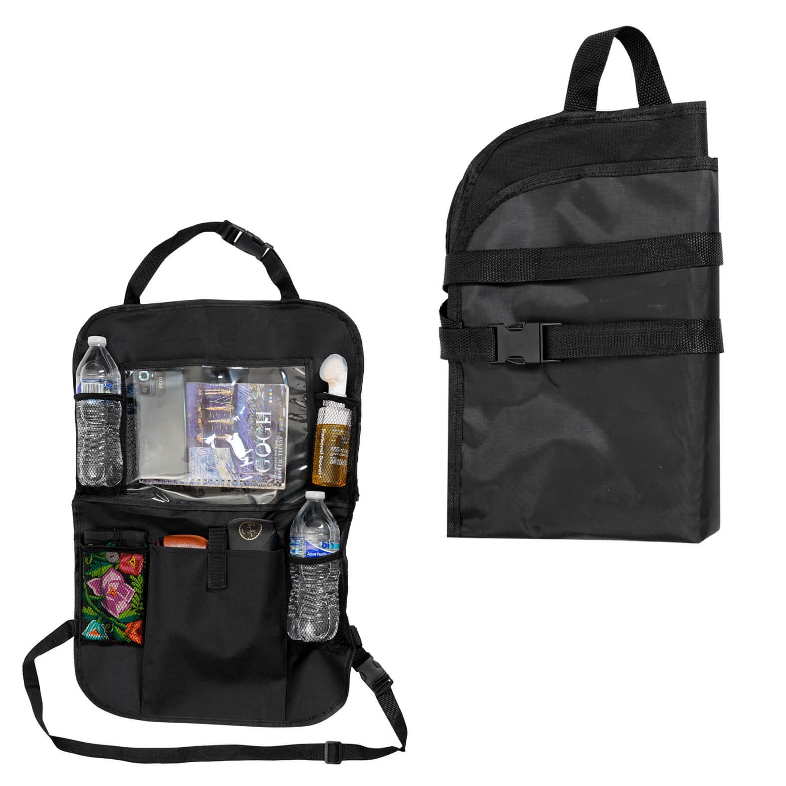 Organizador para asiento de auto, con cuatro bolsillos de malla, un bolsillo con broche de velcro y un bolsillo transparente para tablet o celular. Cuenta con correas ajustables de broche., medidas: 45.0 x 61.5 cm, material: Poliéster, capacidad: , métodos de grabado: Serigrafía