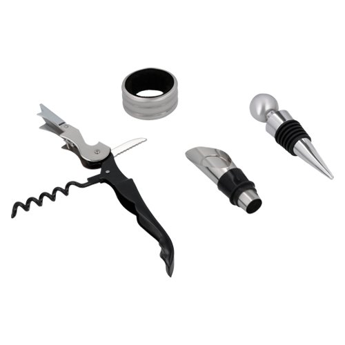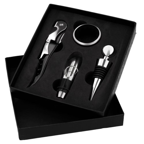 Set de vinos con 4 accesorios: sacacorchos, boquilla, tapón para vino y corta gotas. Incluye estuche., medidas: 15.5 x 13.5 cm, material: Cartón / Acero Inoxidable, capacidad: , métodos de grabado: Grabado Láser,Serigrafía,Tampografía