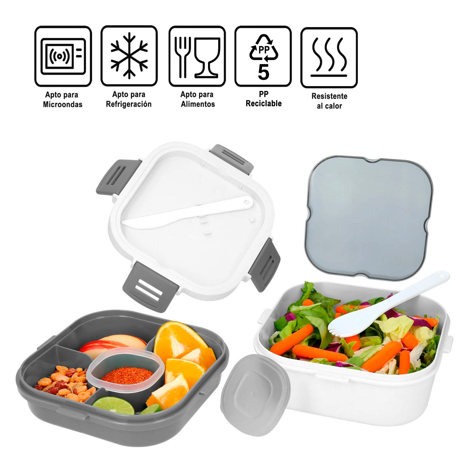 Contenedor de alimentos de plástico con 2 niveles, 1 parte superior con 3 compartimentos y 1 mini recipiente, 1 parte inferior onda, cierre hermetico con 4 broches de seguridad y compartimento para cubiertos., medidas: 17.0 x 8.3 cm, material: Plástico, capacidad: 1,200 ml., métodos de grabado: Serigrafía,Tampografía