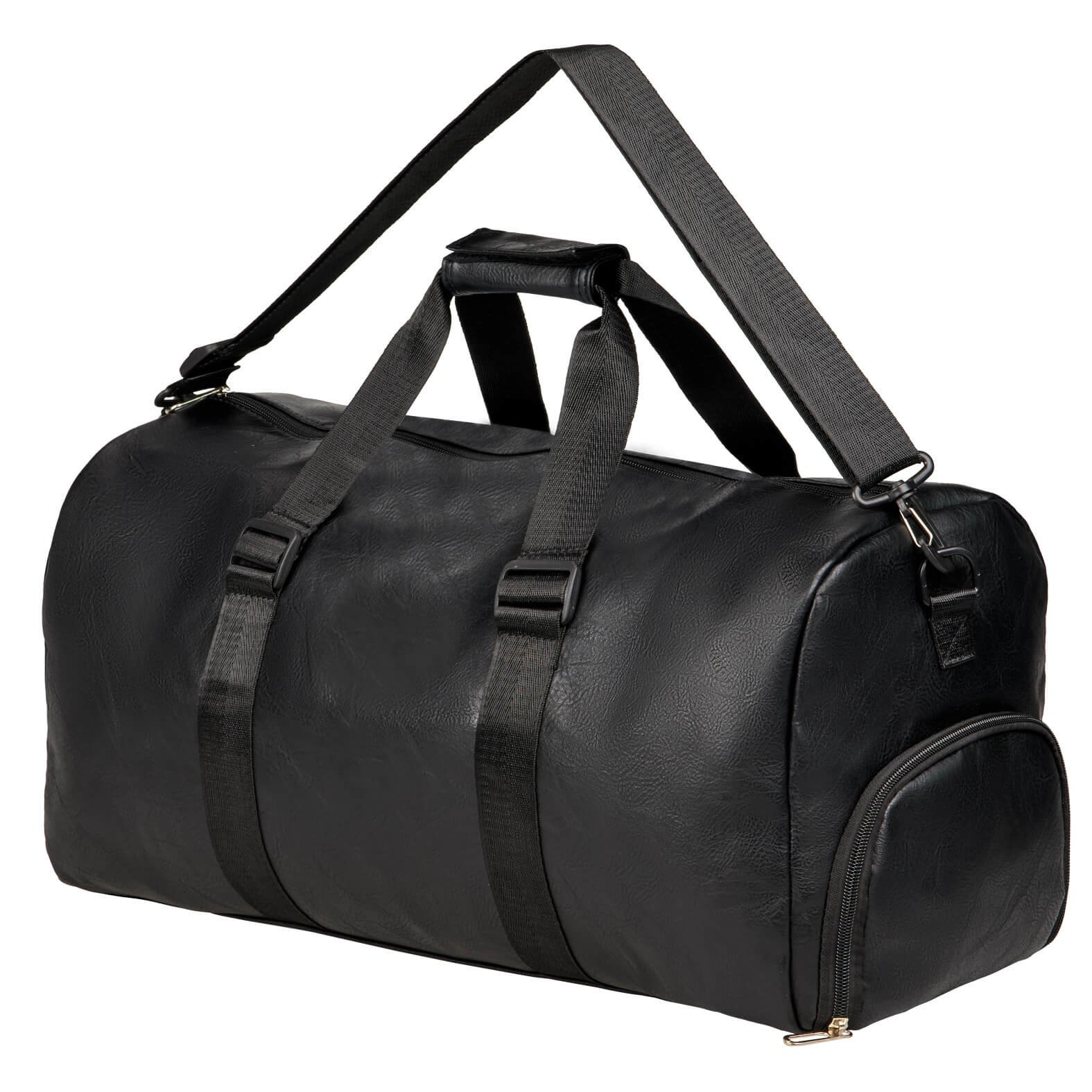 Maleta deportiva de curpiel con compartimento principal, dos bolsillos internos, asas superiores con velcro, zapatera y correa ajustable., medidas: 49.5 x 33.5 cm, material: Poliuretano, capacidad: 25 lts, métodos de grabado: Serigrafía