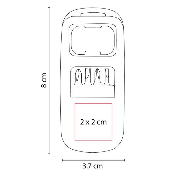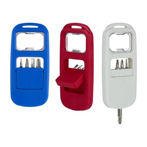 Incluye destapador y 4 puntas de desarmador diferentes e intercambiables.material:Plástico,medida:3.7 x 8 cm