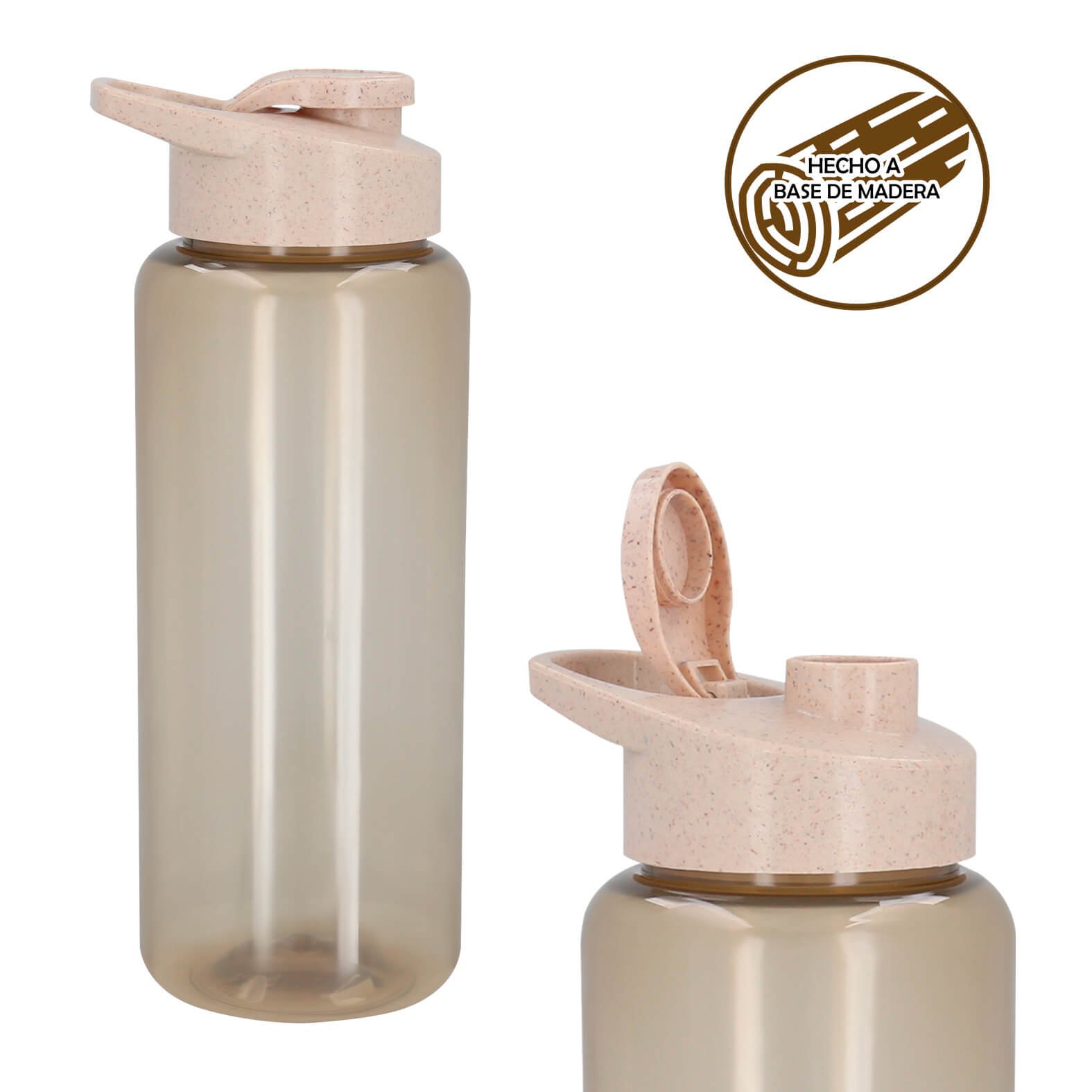 Cilindro de RPET con tapa enroscable hecha a base de madera, asa y boquilla que cierra a presión. (El envío de este material se hace por separado de base y tapas derivado a los cambios de altura si se traslada a otros lugares de la República)., medidas: 8.5 x 23.3 cm, material: RPET / MADERA, capacidad: 1,000 ml., métodos de grabado: Serigrafía,Tampografía