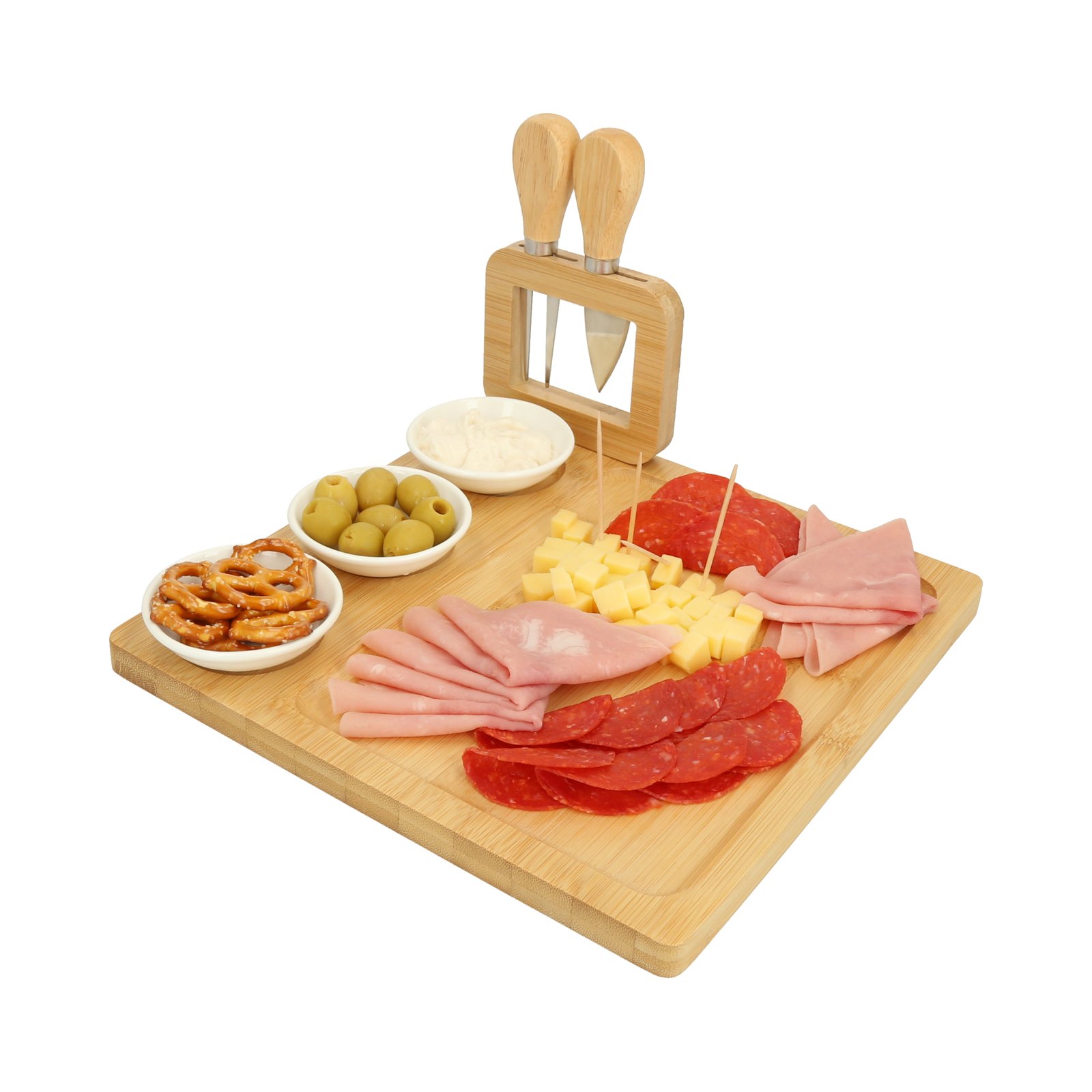 Tabla de quesos que incluye 3 mini platos de cerámica, un tenedor para quesos y un cuchillo., medidas: 25.0 x 25.0 cm, material: Bambú / Acero inoxidable, capacidad: , métodos de grabado: Grabado Láser,Serigrafía,Tampografía