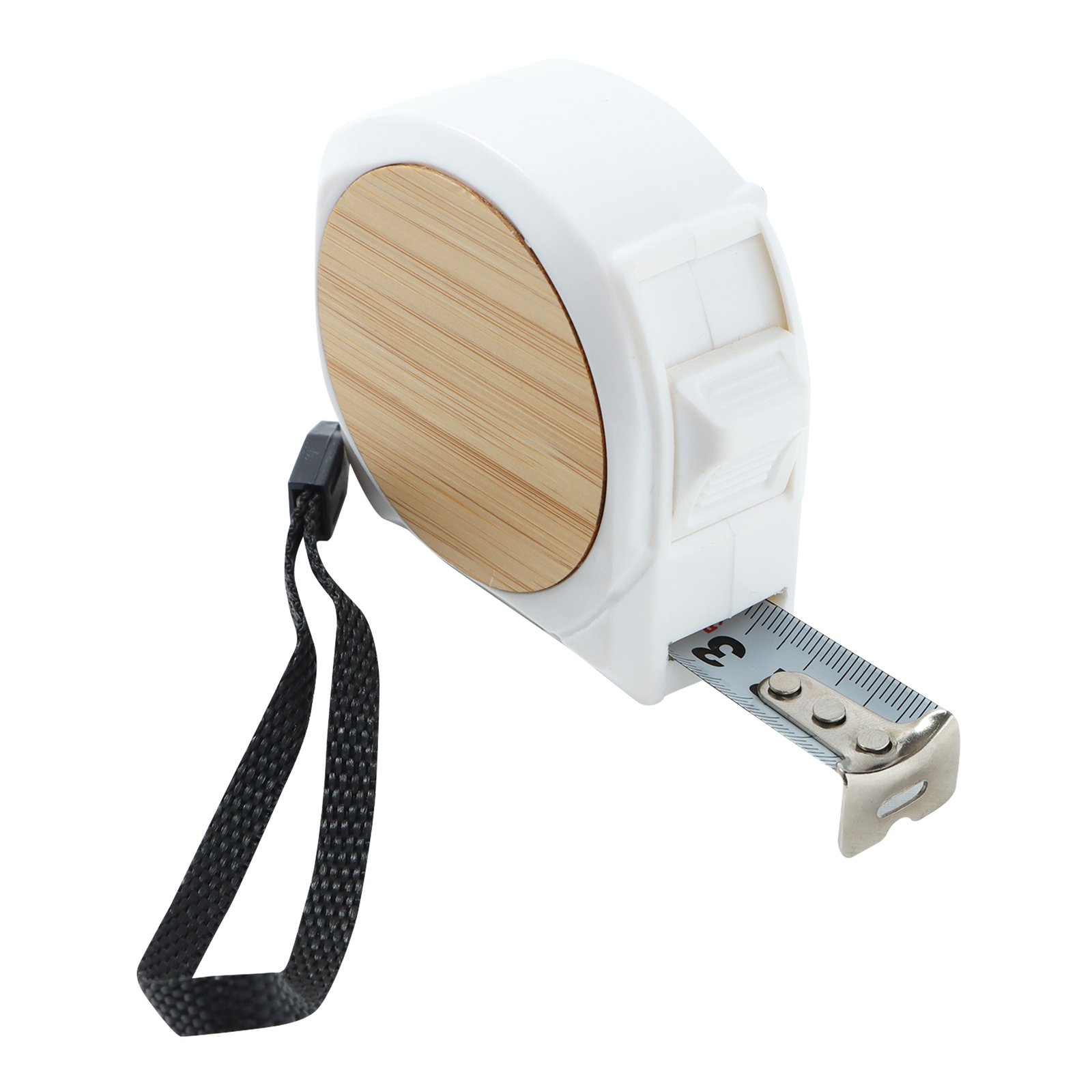 Flexómetro con detalle en bambú y cinta metálica de 5 m. Incluye correa y seguro., medidas: 6.4 x 6.4 cm, material: Plástico / Bambú, capacidad: , métodos de grabado: Grabado Láser,Serigrafía,Tampografía