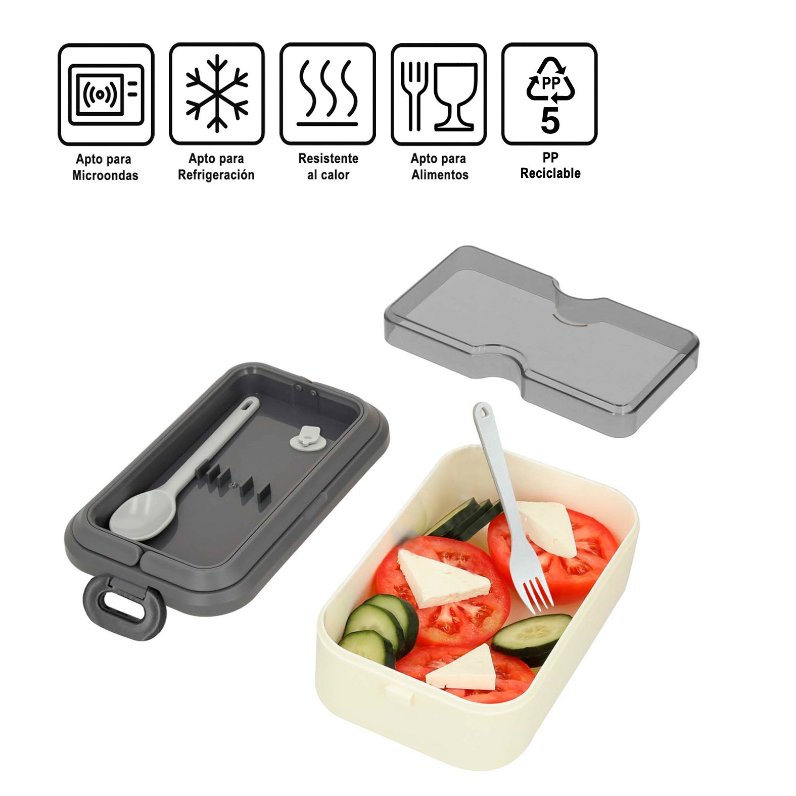 Contenedor de alimentos de plástico, con asas superiores, clips de seguridad y compartimento para cuchara y tenedor., medidas: 19.5 x 8.0 cm, material: Plástico, capacidad: 1,000 ml, métodos de grabado: Serigrafía,Tampografía