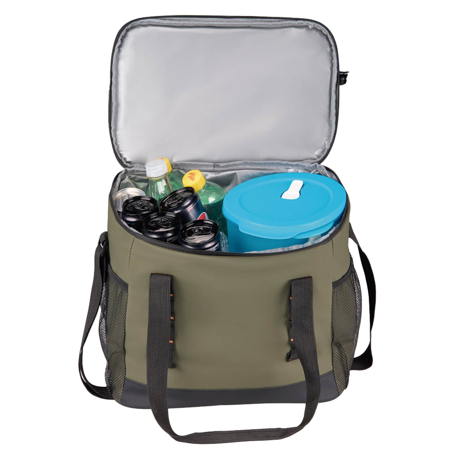 Hielera rectangular con interior impermeable plastificado con cierre, dos mallas laterales, asas con velcro y correa ajsutable., medidas: 30.0 x 38.5 cm, material: Poliéster, capacidad: 19 lts., métodos de grabado: Serigrafía