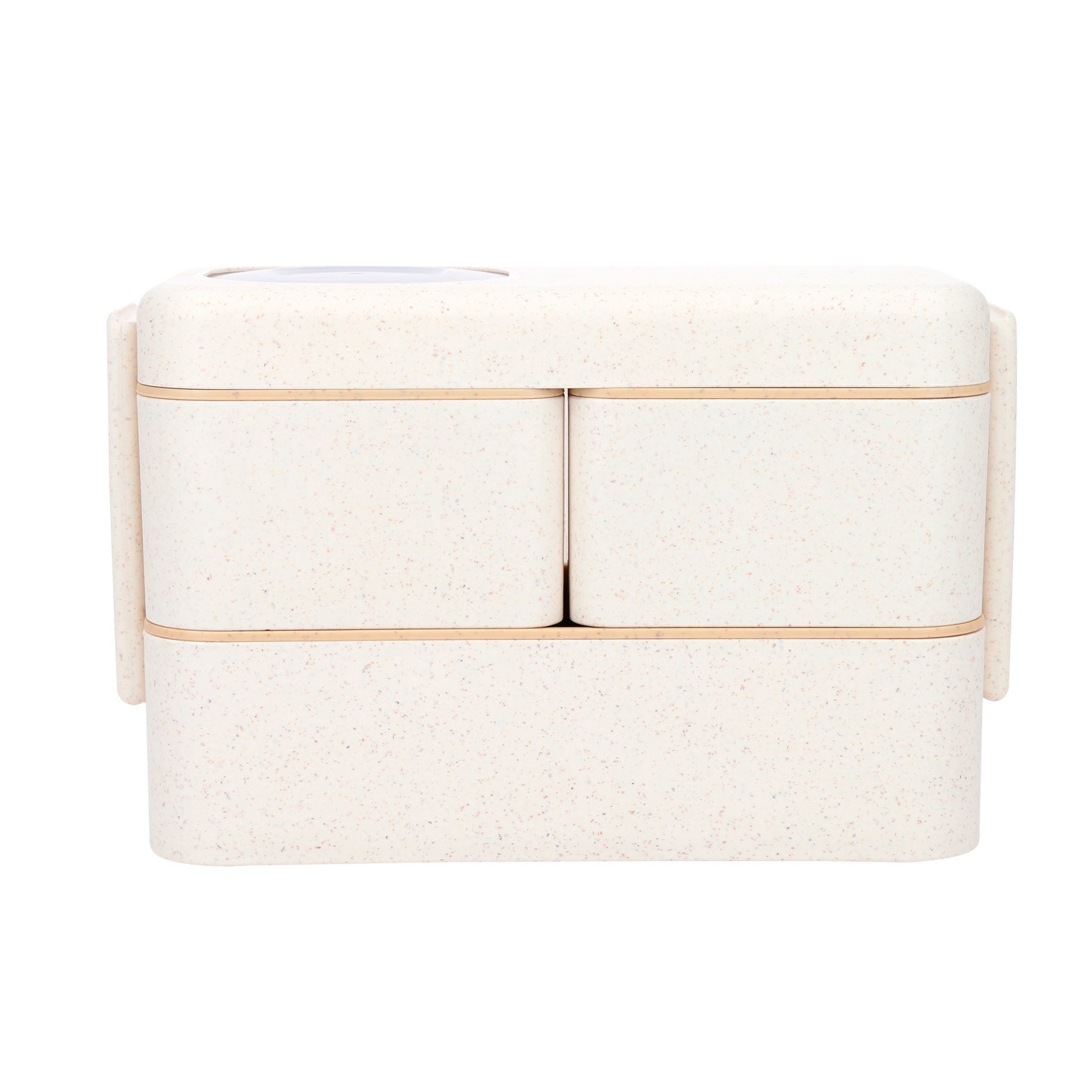 Contenedor de alimentos de weat straw de 2 niveles con 3 compartimentos ensamblables, un mini recipiente, espacio para cuchara y tenedor., medidas: 18.2 x 8.7 cm, material: Wheat Straw, capacidad: 1,050 ml, métodos de grabado: Serigrafía,Tampografía