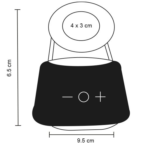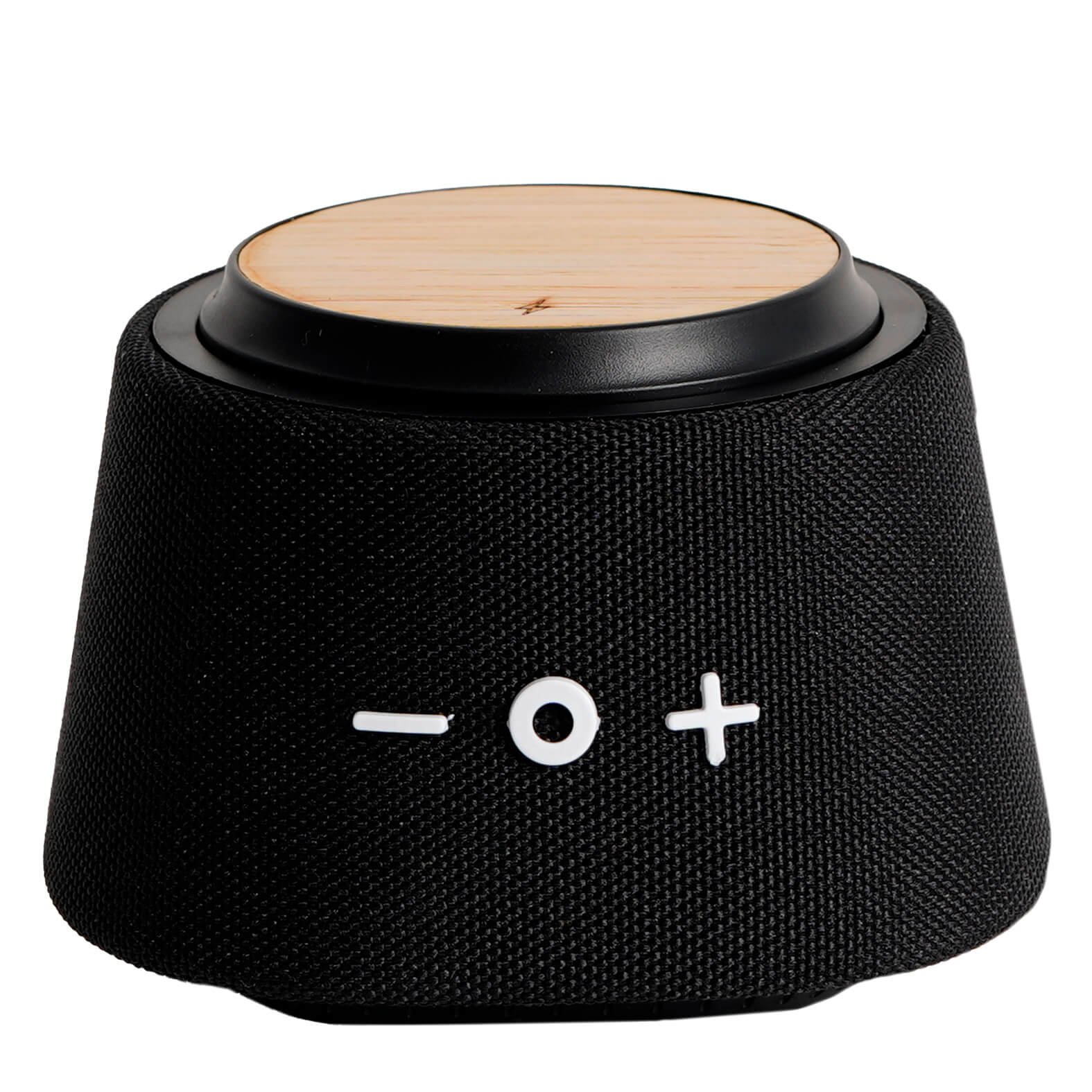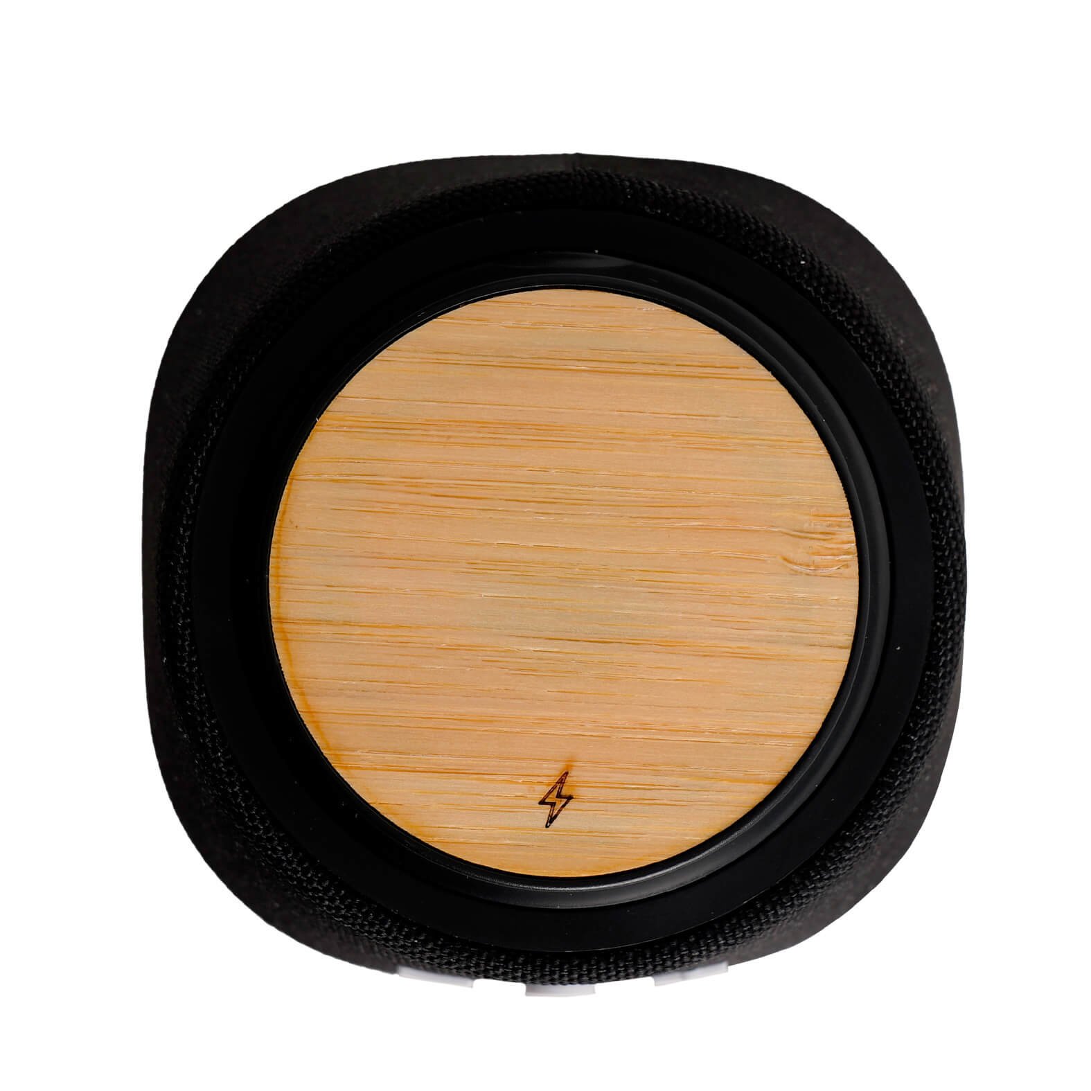 Bocina con bluetooth con controles adelante/atrás, play/pausa y carga tipo C. Cuenta con brazo retráctil que sirve como cargador wireless. Medidas del producto, Alto: 6.5 cm. Ancho: 9.5 cm. Material: ABS/Madera. Capacidad: 400 mAh. Método de impresión: Grabado Láser-Serigrafía-Tampografía