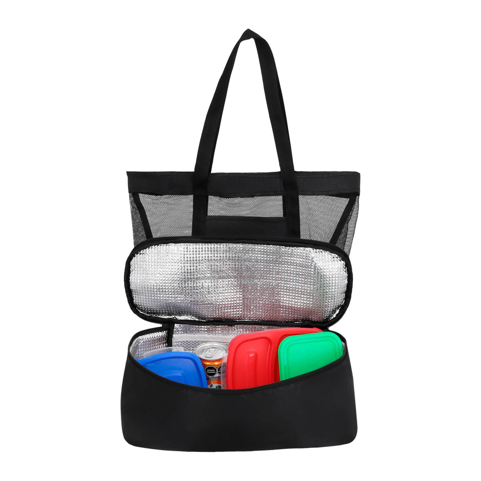 Bolsa de red con 1 compartimento principal, 1 bolsa frontal y lonchera metalizada con cierre en la parte inferior, cuenta con 2 asas superiores., medidas: 36.7 x 43.5 cm, material: Poliéster, capacidad: 18 lts, métodos de grabado: Serigrafía