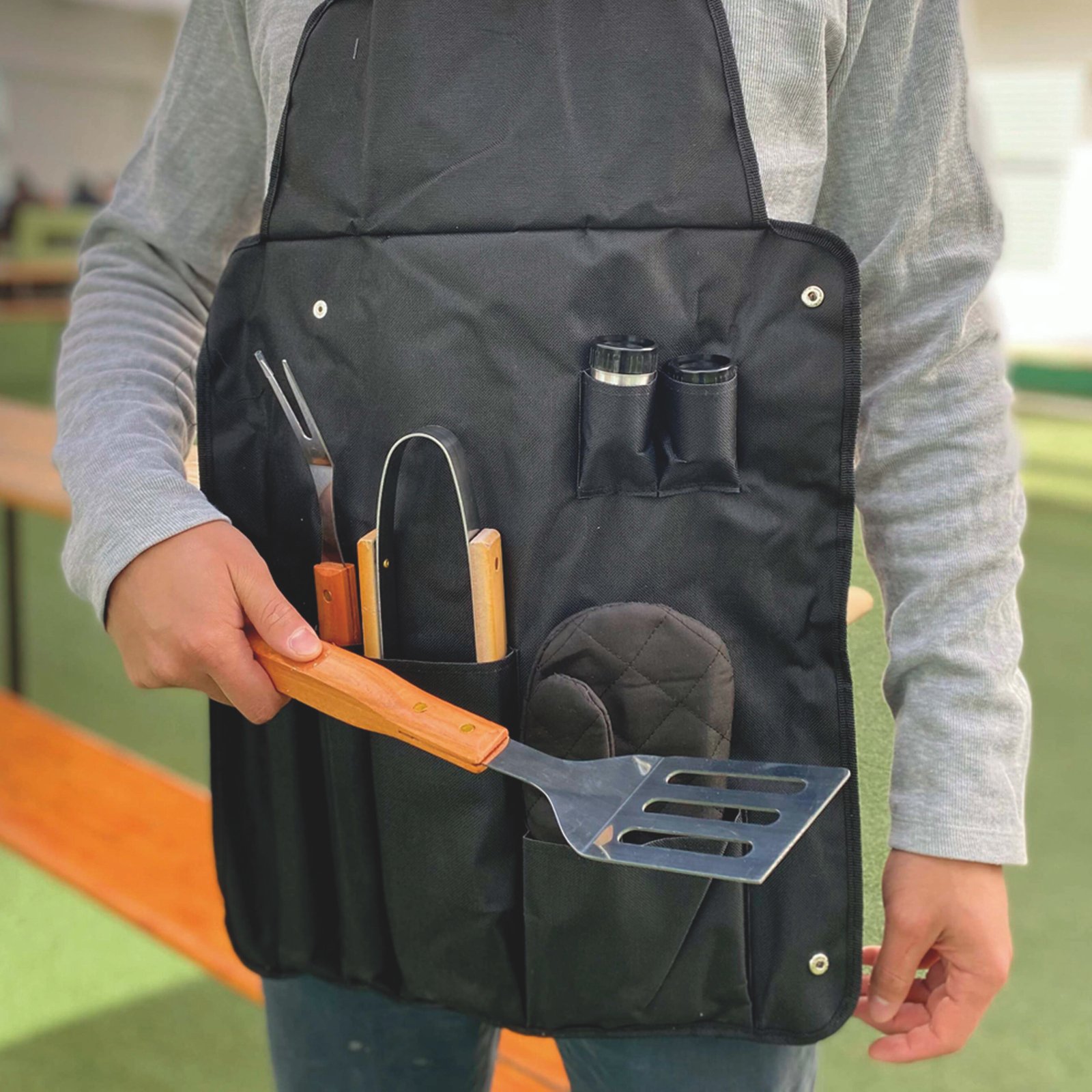 Set de BBQ en estuche que también es mandil. Incluye 7 piezas: mandil, volteador, tenedor asador, pinzas, salero, pimentero y guante., medidas: 43.0 x 61.0 cm, material: Poliéster/Acero Inoxidable, capacidad: , métodos de grabado: Grabado Láser,Serigrafía,Tampografía