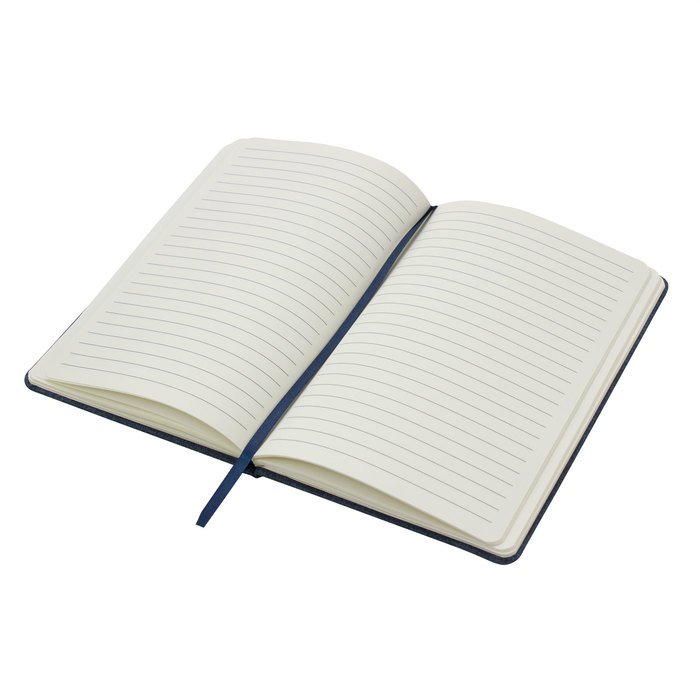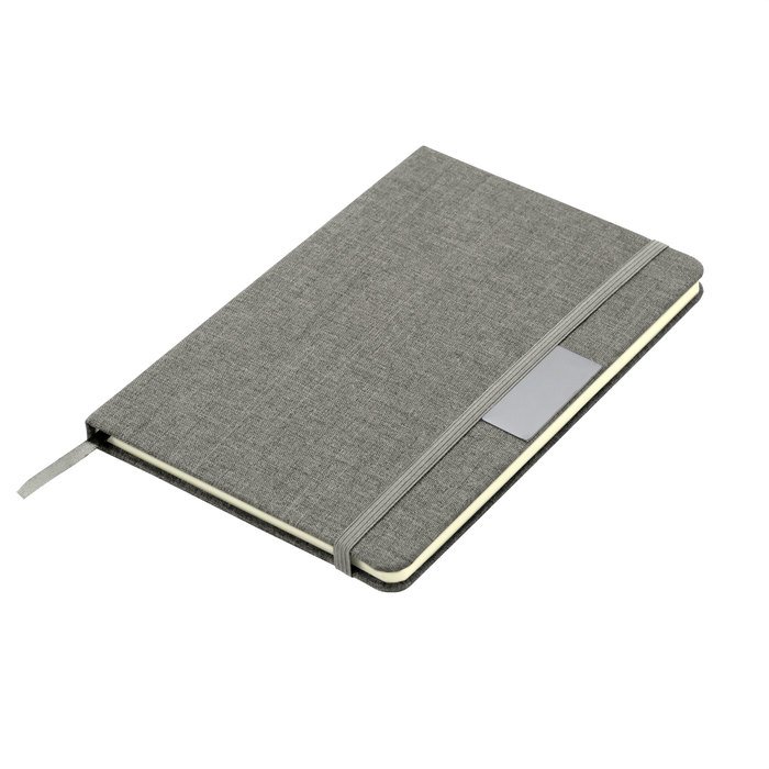 Libreta con placa metálica. Tapa de cartón de 300g recubierta en RPET 310. Placa metálica de 5 x 2 cm. Interior de 80 hojas rayadas en papel obra de 70g. Encuadernación cosida. Cierre con banda elástica del mismo color de la tapa.Medidas: 14 x 21 x 1,5 cm.  Materiales: Papel, Cartón, RPET, metal.