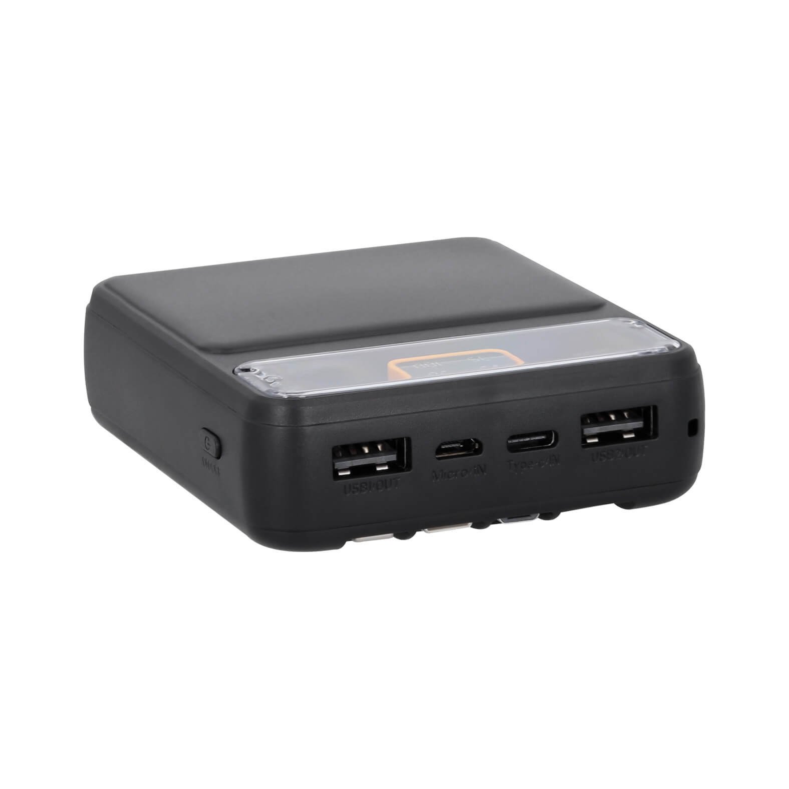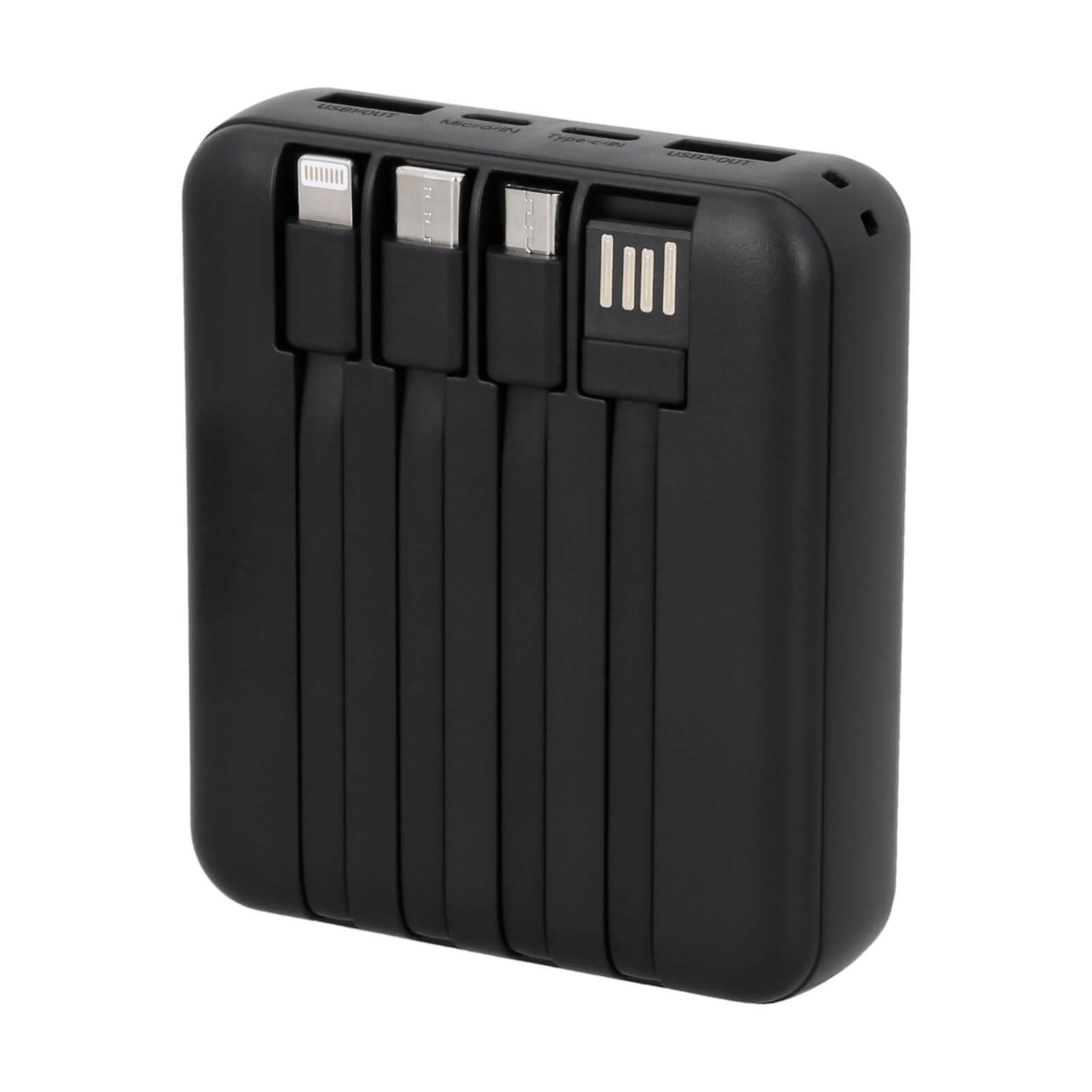 Power Bank de 8,000 mAh con carga rápida, cables para dispositivos de entrada USB, micro USB, tipo C y lightning, además de 2 puertos USB, 1 Micro y 1 tipo C. Incluye indicador de carga y botón de encendido o apagado. Material: Plástico. Capacidad: 8,000 mAh. Método de impresión: Serigrafía-Tampografía. Área de impresión: 5 x 3 cm