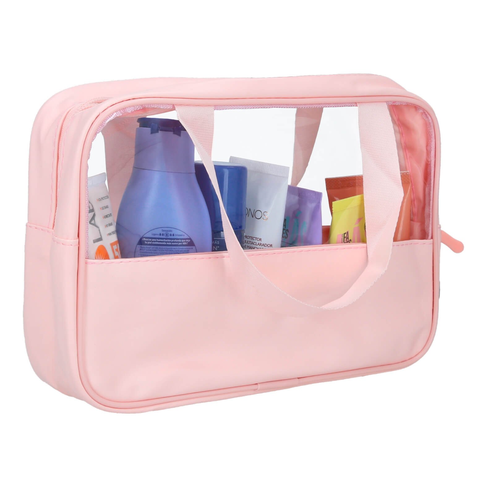 Cosmetiquera de plástico con parte superior transparente, costuras en color rosa, cierre y doble asa., medidas: 25.5 x 17.0 cm, material: Plástico, capacidad: , métodos de grabado: Serigrafía
