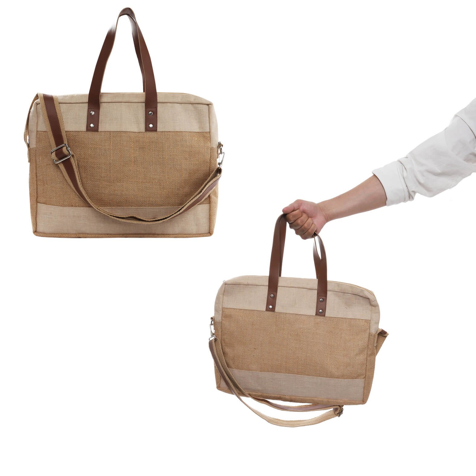 Portafolio de yute laminado con interior de algodón, 1 compartimento con broche de velcro para porta laptop, cierre, correa ajustable y asas., medidas: 39.5 x 29.5 cm, material: Yute, capacidad: , métodos de grabado: Bordado,Serigrafía