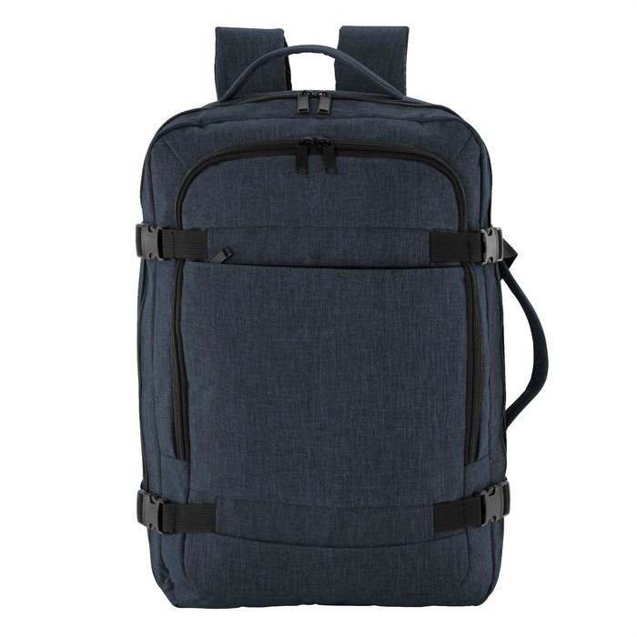 Mochila carry on con 4 compartimentos acolchados. Compartimento principal central con cierre de apertura 360° y elástico con hebilla para contener la ropa en un viaje de trabajo. Compartimento posterior con cierre y portanotebook de hasta 17 pulgadas. Compartimento frontal, exterior con cierre horizontal e interior con bolsillos organizadores. Dos asas, vertical y horizontal para un mejor traslado. 4 correas de hebillas ajustables al volúmen que se traslade. Espalda acolchada con red que permite ventilación. Tira para sujetar la mochila en la manija extensible de un equipaje de mano. Correas acolchadas. Tiradores de cierre plásticos. Medidas: 32 x 46 x 20 cm. Capacidad: 20 litros.