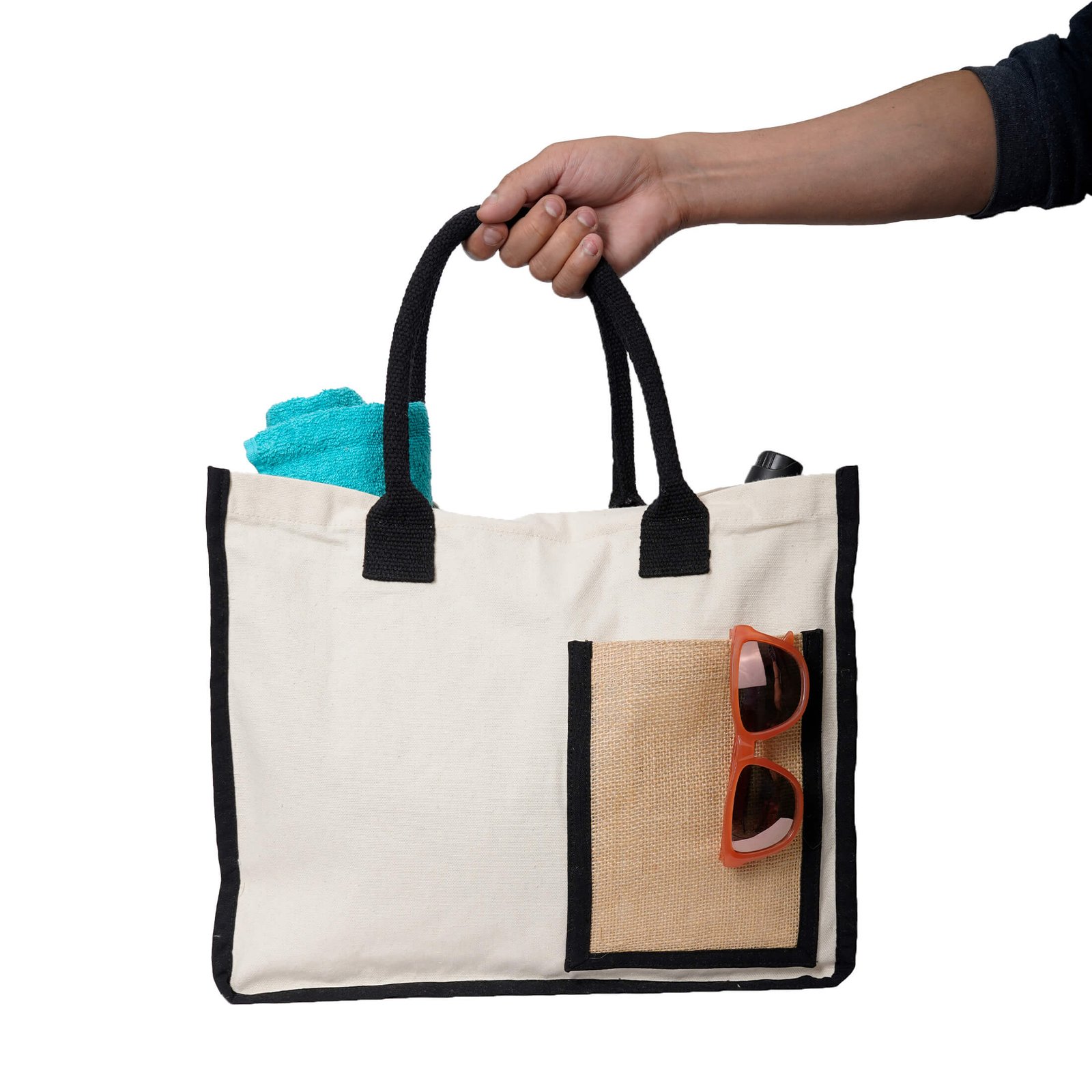 Bolsa de algodón de 120 g/m², con resistentes asas cosidas y bolsillo frontal en yute natural de 320 g/m²., medidas: 32.0 x 39.0 cm, material: Yute, capacidad: , métodos de grabado: Bordado,Serigrafía