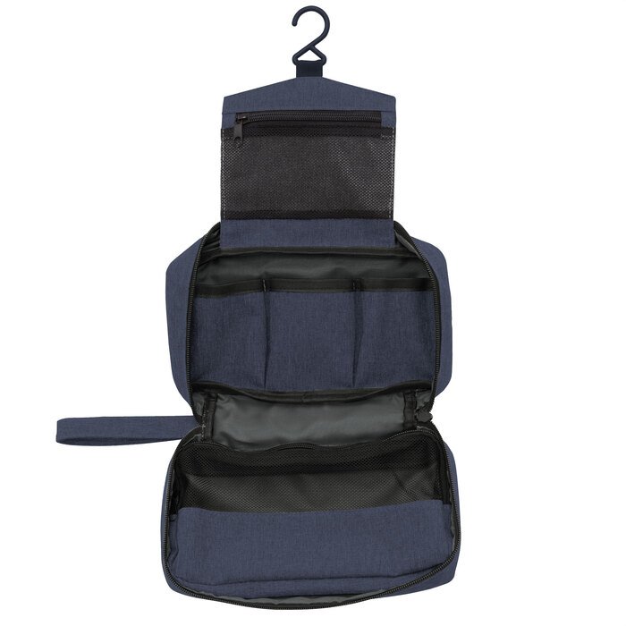 Organiza tu viaje con estilo Y practicidad.Necessaire colgante. Compartimento principal con cierre y asa de tela para transportar. Interior: compartimento superior rebatible con gancho para colgar y bolsillo de red con cierre, compartimento central con 3 bolsillos y amplio compartimento inferior con ventana de red y cierre. Medidas: 25 x 7,5 x 13 cm (cerrado) y 25 x 7,5 x 51 cm (abierto). Materiales: Poliester 300D.