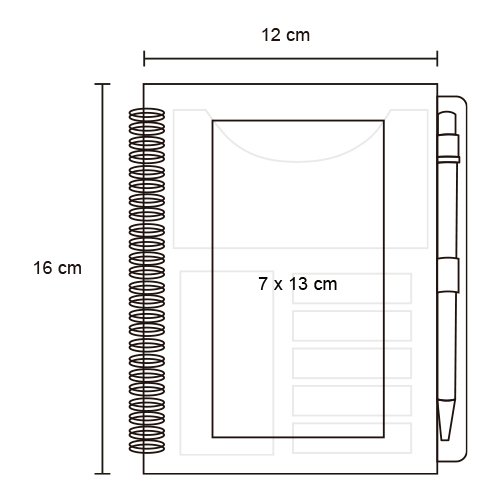Libreta ecológica de cartón con espiral y plástico protector, incluye: 5 banderas adheribles, bolígrafo, porta tarjetas, block de notas y 70 hojas de raya., medidas: 12.0 x 16.0 cm, material: Cartón, capacidad: 70 Hojas, métodos de grabado: Serigrafía,Tampografía