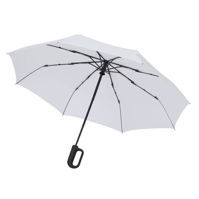 Paraguas APERTURA Y CIERRE AUTOMATICO. Eje y varillas metálicas. Mango con asa y sistema mosquetón, de plástico engomado color negro mate. Botón a presión. Cierre con correa de velcro. Medidas: Ø 97 cm. 8 gajos. Ancho gajo 36,5 cm. Largo cerrado 33,5 cm. Largo abierto 60 cm.