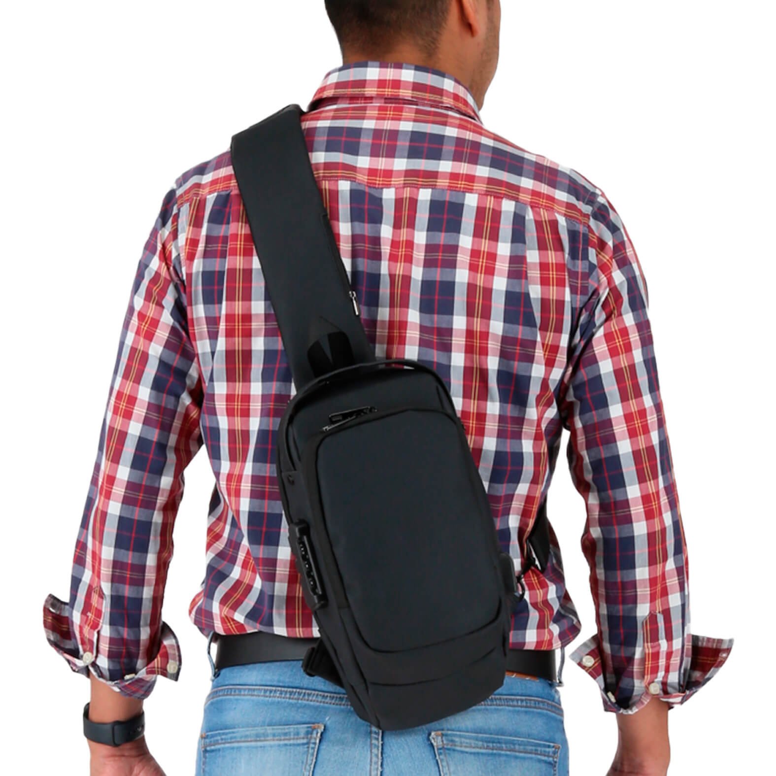 Bolsa de hombro con 4 compartimentos.1 compartimento principal con doble cierre, candado de seguridad, 3 compartimentos internos y entrada lateral de batería portátil (Incluye cable), además de 2 compartimentos secundarios y 1 mini compartimento en la correa ajustable, cuenta con 2 asas superiores., medidas: 17.0 x 30.5 cm, material: Vinipiel, capacidad: , métodos de grabado: Serigrafía