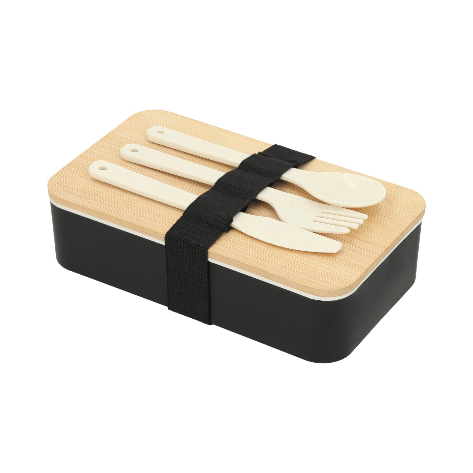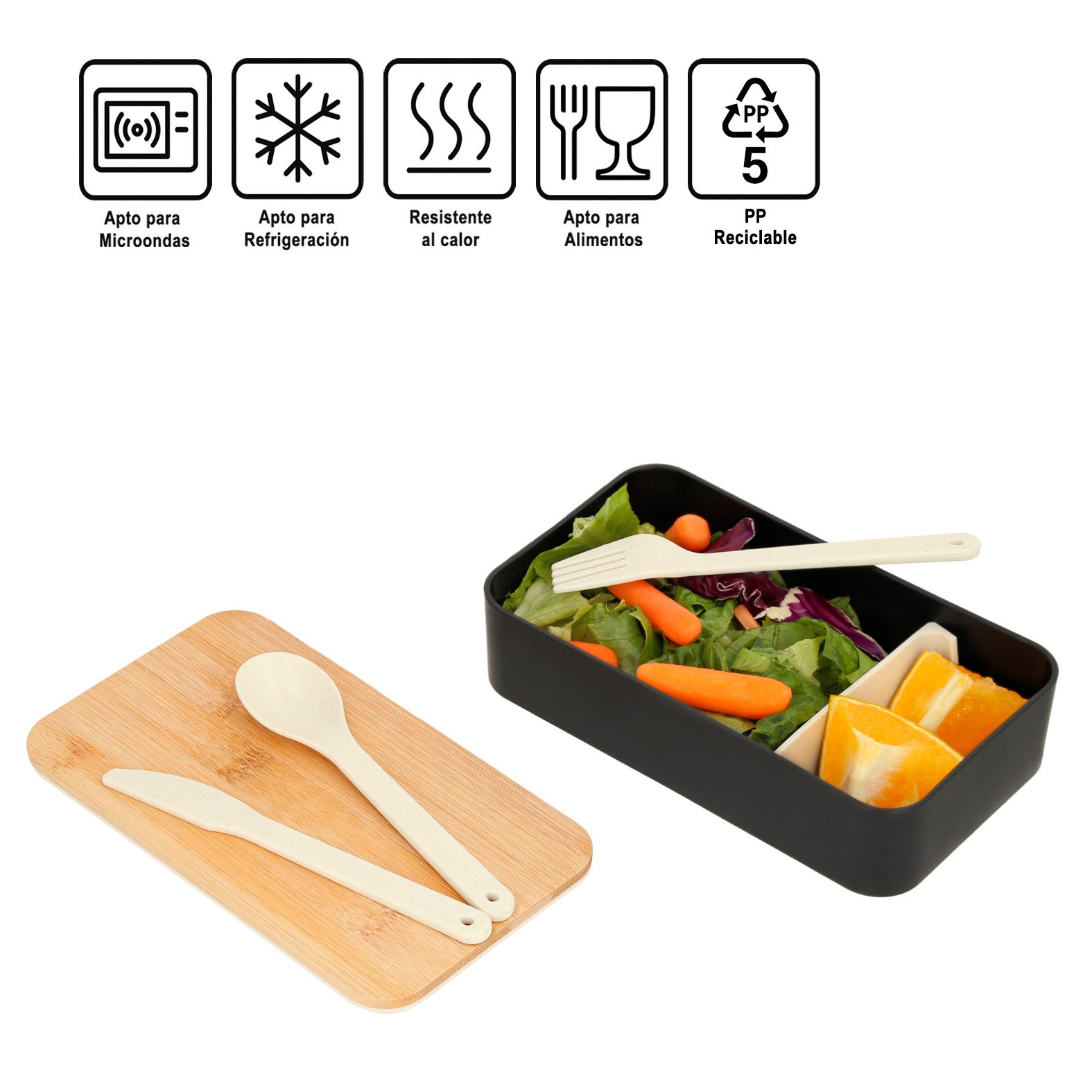Contenedor de alimentos de poliuretano, tapa de bambú, separador de comida y cubiertos (Cuchara, tenedor y cuchillo)., medidas: 18.3 x 4.5 cm, material: Poliuretano, capacidad: 600 ml, métodos de grabado: Grabado Láser,Serigrafía,Tampografía