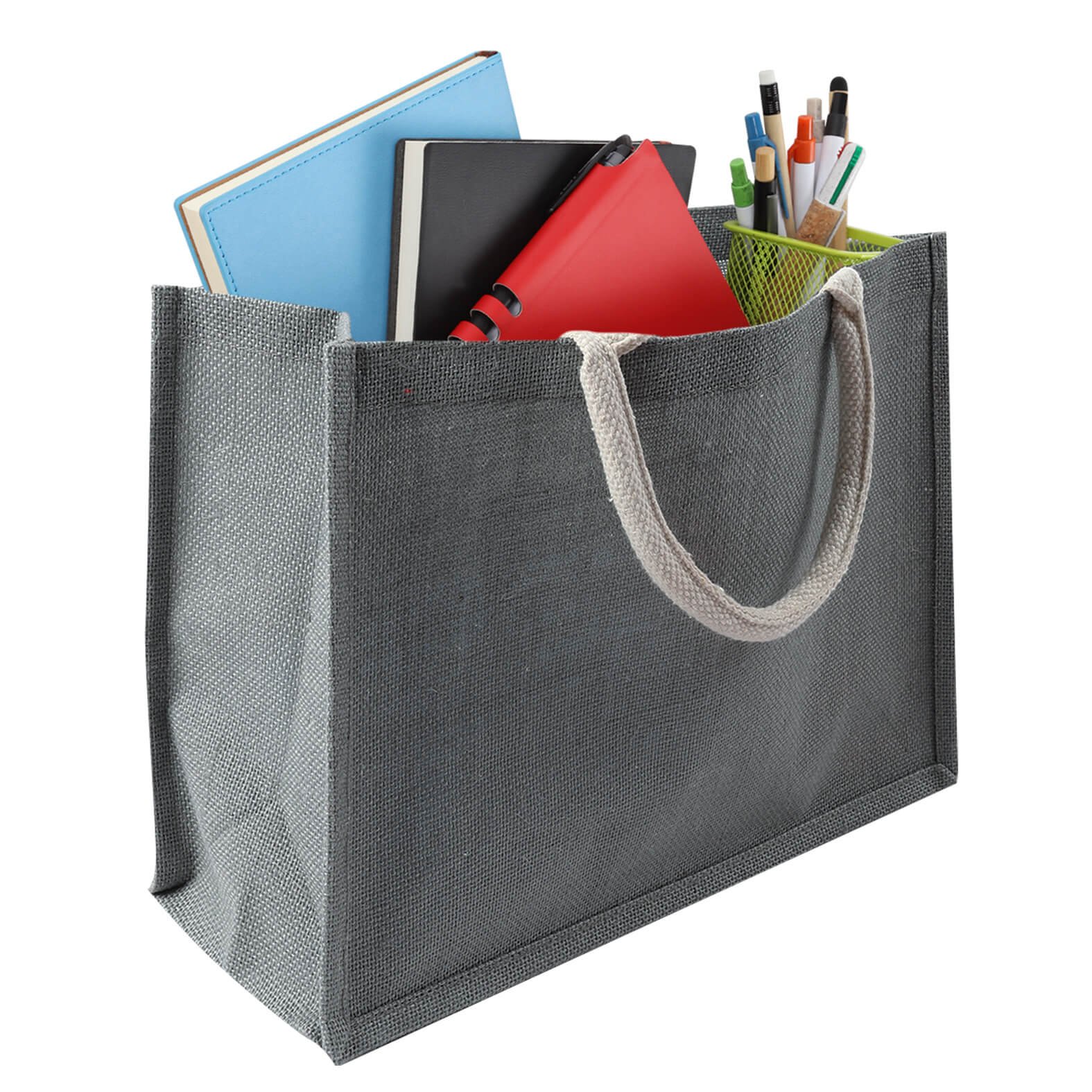Bolsa de yute laminado con un compartimento y asas de algodón., medidas: 36.0 x 27.0 cm, material: Yute, capacidad: , métodos de grabado: Bordado,Grabado Láser,Serigrafía