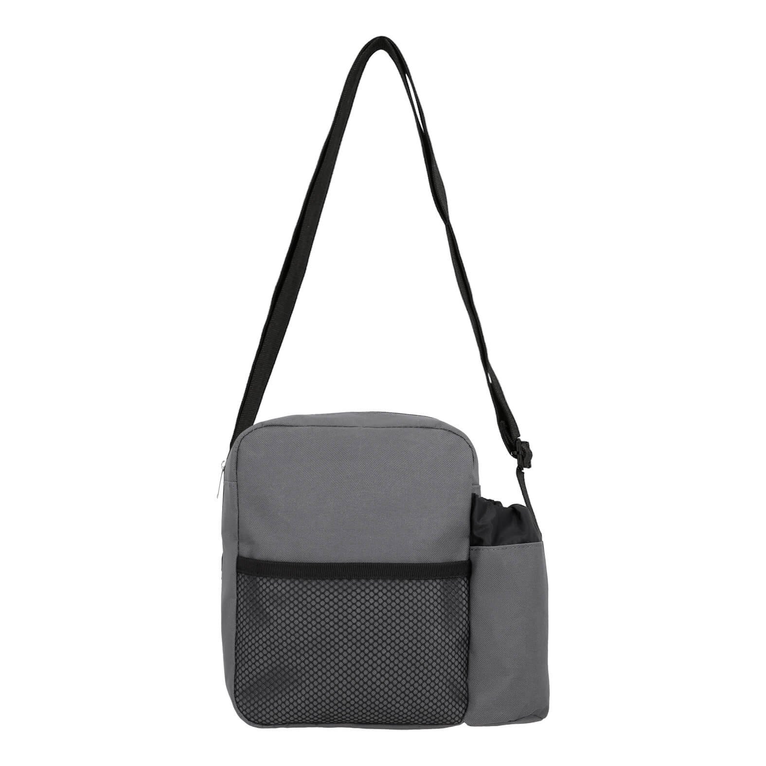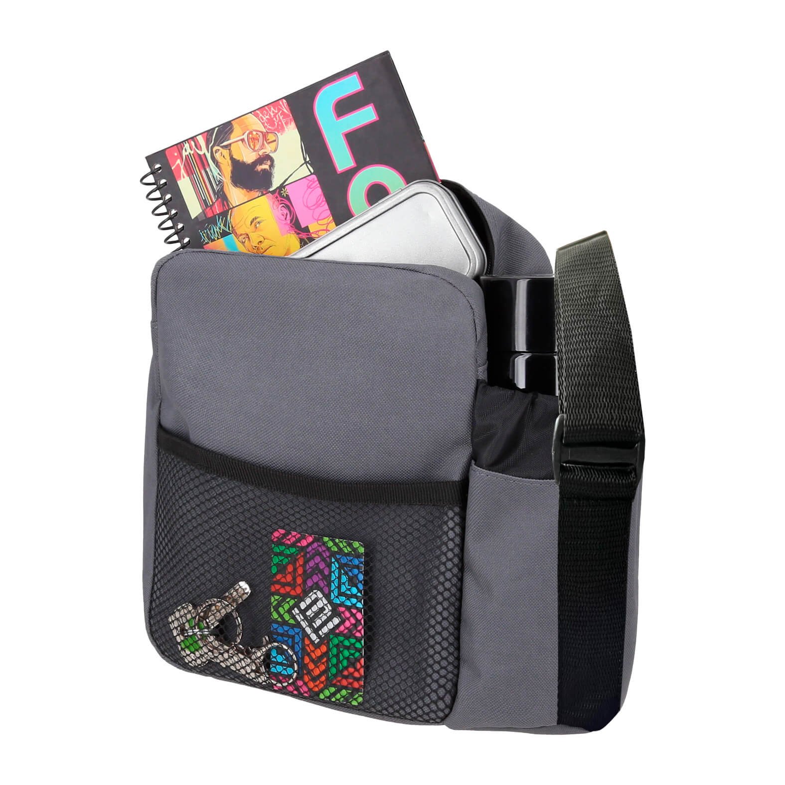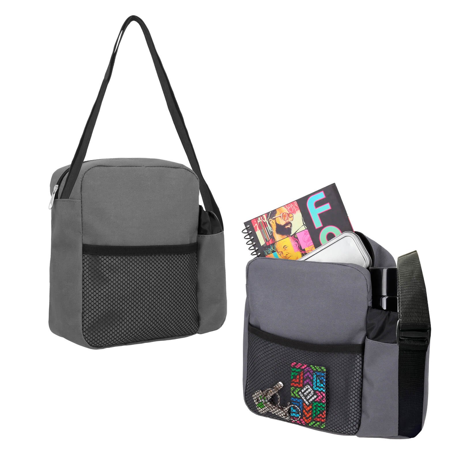 Bolsa de hombro con 1 compartimento principal, 1 compartimento frontal de malla, 1 compartimento lateral y correa ajustable con broche de seguridad., medidas: 25.0 x 23.5 cm, material: Poliéster, capacidad: , métodos de grabado: Serigrafía
