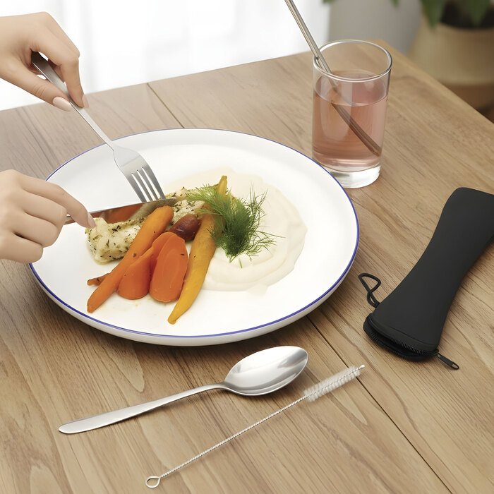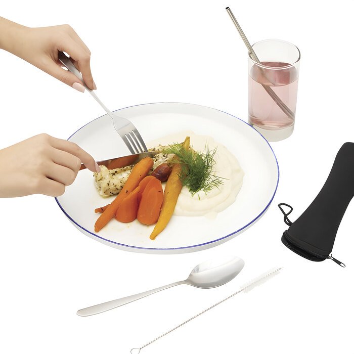 Set de cubiertos. 5 elementos: Cuchara, tenedor y cuchillo en acero 430; Popote y cepillo para popote en acero 304. Estuche de eva con cierre y correa de poliéster, color negro. Medida estuche: 7 x 21,5 cm.