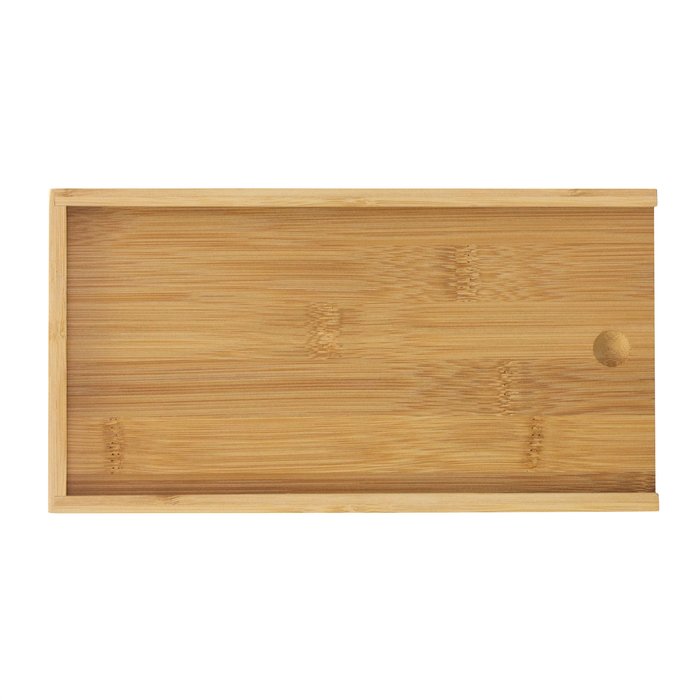 Set de accesorios para vino y corte de quesos. Caja con tapa deslizable de bambú. Tapa / tabla de corte de 24 x 12 x 0,8 cm. Contiene 5 piezas: Destapador sacacorchos (acero inoxidable 420, 11 cm. y 50 g.); Cuchillo y tenedor de queso (acero inoxidable 420 con mango de madera de caucho, 12,8 cm. y 25 g. c/u) Anillo de vino (acero inoxidable 420 y non woven, Ø 3,9 cm.) ; y Tapón de vino (aleación de zinc, 56 g.). Medidas: 24.5 x 13 x 3.3 cm. (caja). Materiales: Bambú y acero inoxidable.