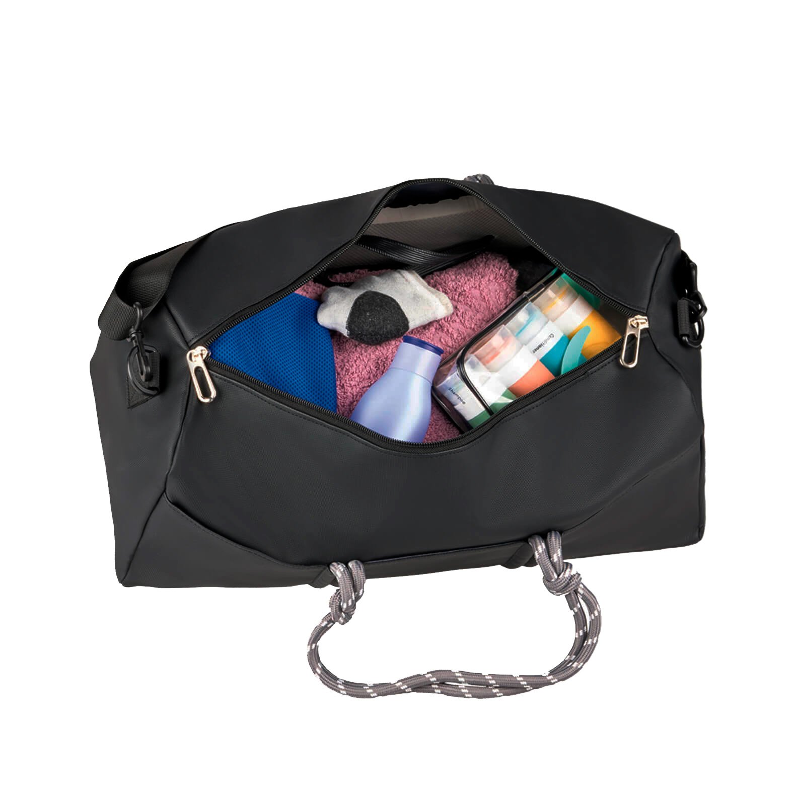 Maleta deportiva con compartimento principal, bolsillo interno con cierre, bolsa frontal, dos bolsillos laterales y correa ajustable., medidas: 42.0 x 21.5 cm, material: Poliuretano, capacidad: 14 lts, métodos de grabado: Serigrafía