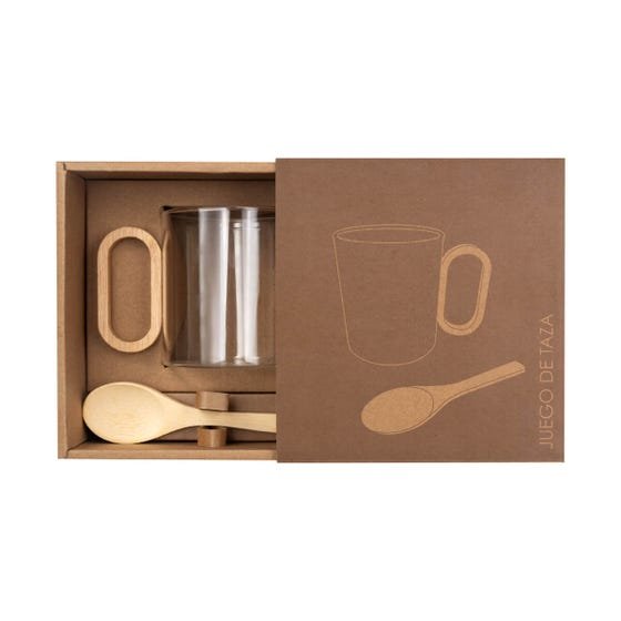 Taza de vidrio con asa de bambú. Su diseño minimalista combina materiales naturales con una estética moderna. Incluye una cuchara de bambú ideal para café, té o infusiones, todo presentado en un empaque kraft que realza su esencia orgánica. Capacidad de 13 Oz. El bambú es un producto natural el cual puede presentar variaciones en tonalidades y vetas. Incluye caja individual. MATERIAL: Vidrio Borosilicato / Bambú, MEDIDA: 8 x 9.4 x 11.5 cm Taza / 3.7 x 13 cm cuchara CAPACIDAD: 400 ml