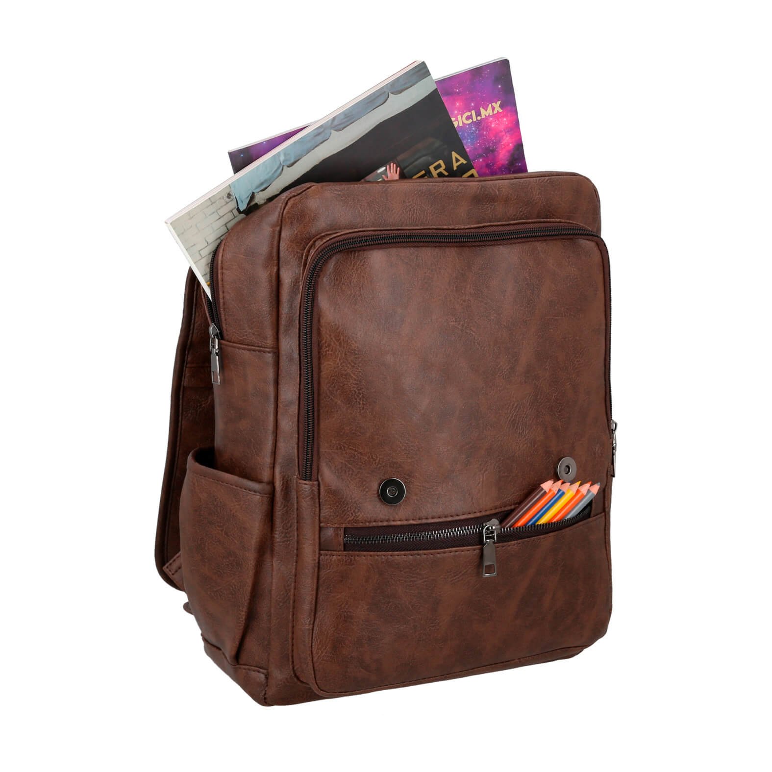 Mochila de curpiel de 1 compartimento principal con porta laptop y organizador interno, 1 compartimento secundario, 2 bolsas frontales con cierre, 2 bolsas laterales, tirantes y asa superior., medidas: 27.0 x 38.0 cm, material: Curpiel, capacidad: 8 lts, métodos de grabado: DTF,Grabado Láser,Serigrafía