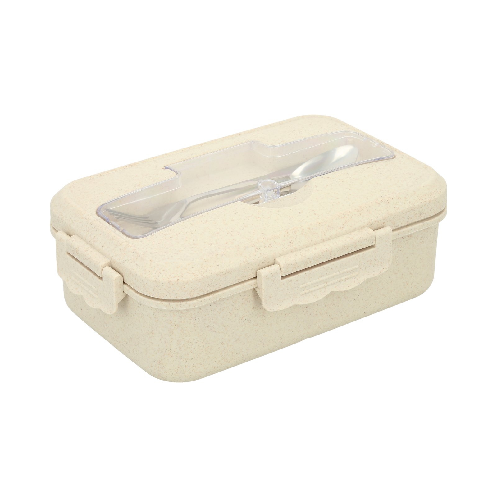 Contenedor para alimentos de wheat straw, con clips de seguridad, 3 compartimentos interiores, 1 compartimento superior transparente para cubiertos y soporte para celular. Incluye cuchara, tenedor y cuchillo de metal., medidas: 20.0 x 7.0 cm, material: Plástico, capacidad: 1,100 ml, métodos de grabado: Serigrafía