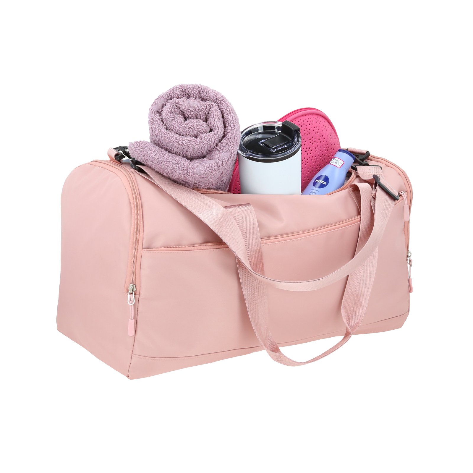 Maleta deportiva con 4 compartimentos: 1 compartimento principal, 1 compartimento para calzado, 1 compartimento lateral 1 frontal, 2 asas y correa ajustable., medidas: 48.5 x 31.5 cm, material: Poliéster, capacidad: 35 lts, métodos de grabado: DTF,Serigrafía