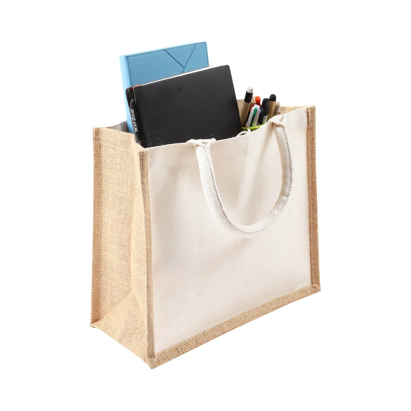 Bolsa de yute laminada con frente de loneta y asas de algodón., medidas: 40.5 x 35.2 cm, material: Algodón / Yute, capacidad: , métodos de grabado: Bordado,Serigrafía