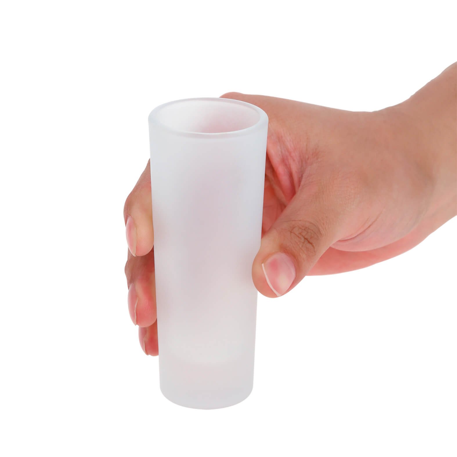 Tequilero de vidrío con acabado frost sublimable., medidas: 4.1 x 10.5 cm, material: Vidrio, capacidad: 75 ml., métodos de grabado: Serigrafía,Sublimación,Tampografía