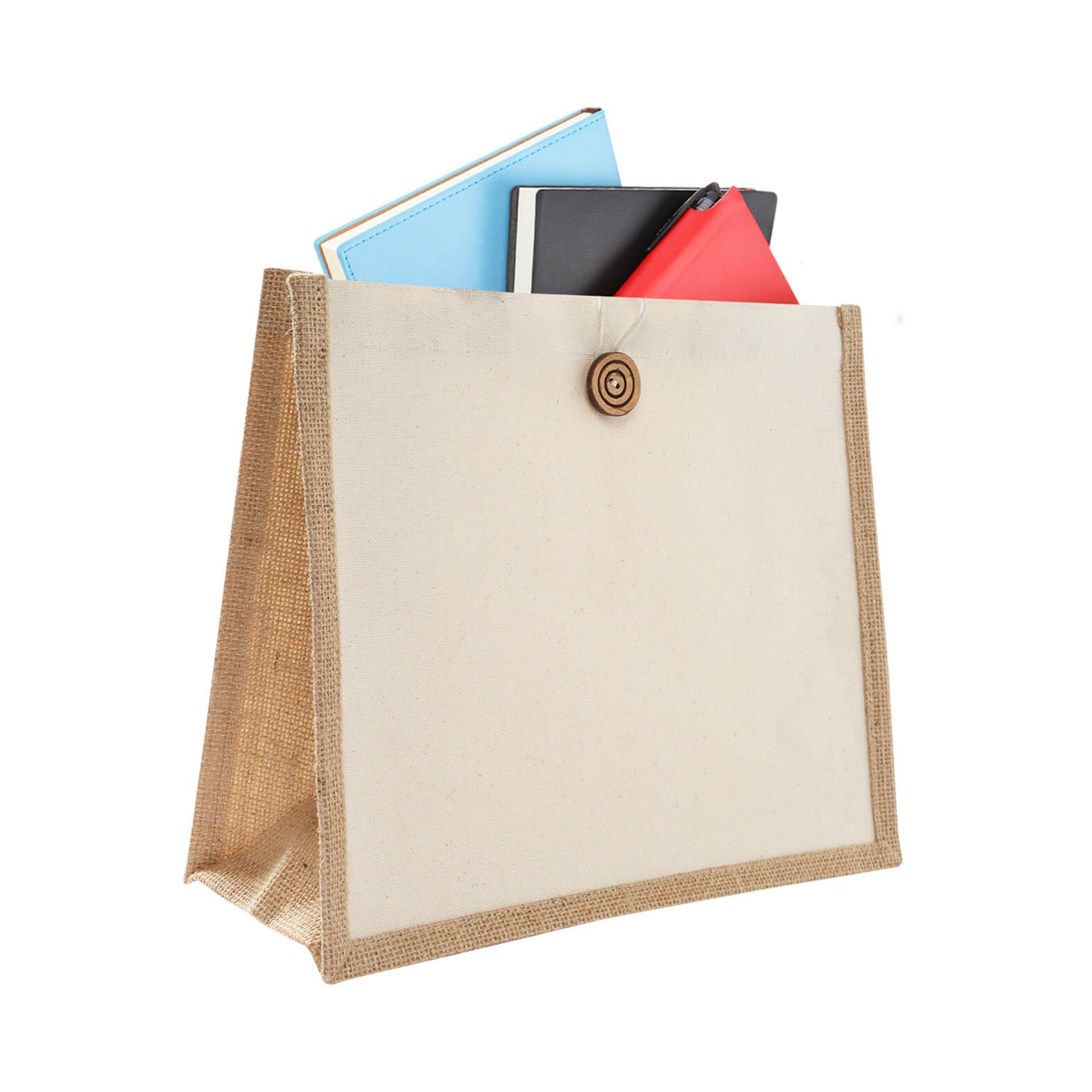 Bolsa de loneta laminada con yute de 1 compartimento con botón para cierre y asas., medidas: 30.5 x 26.0 cm, material: Algodón / Yute, capacidad: , métodos de grabado: Bordado,Serigrafía
